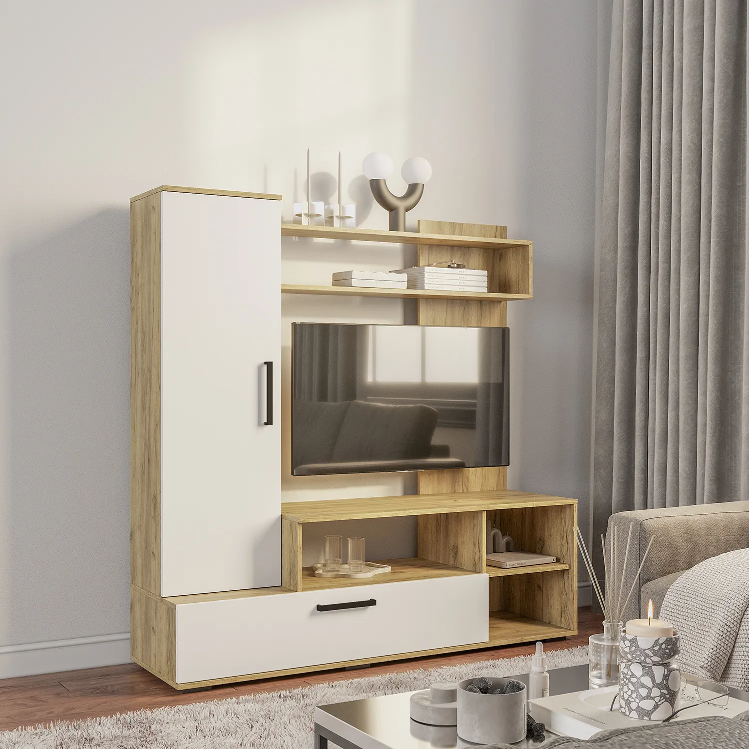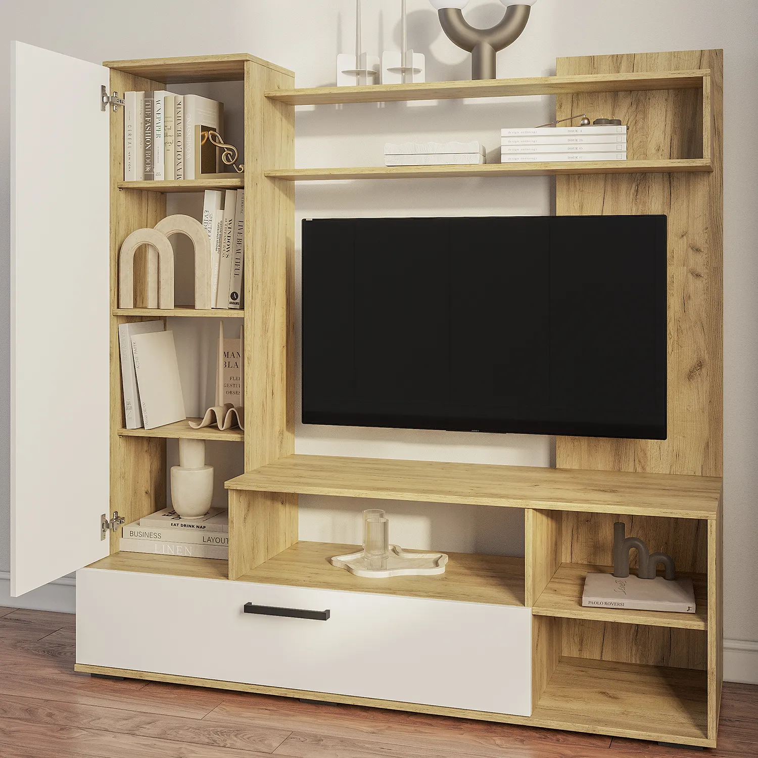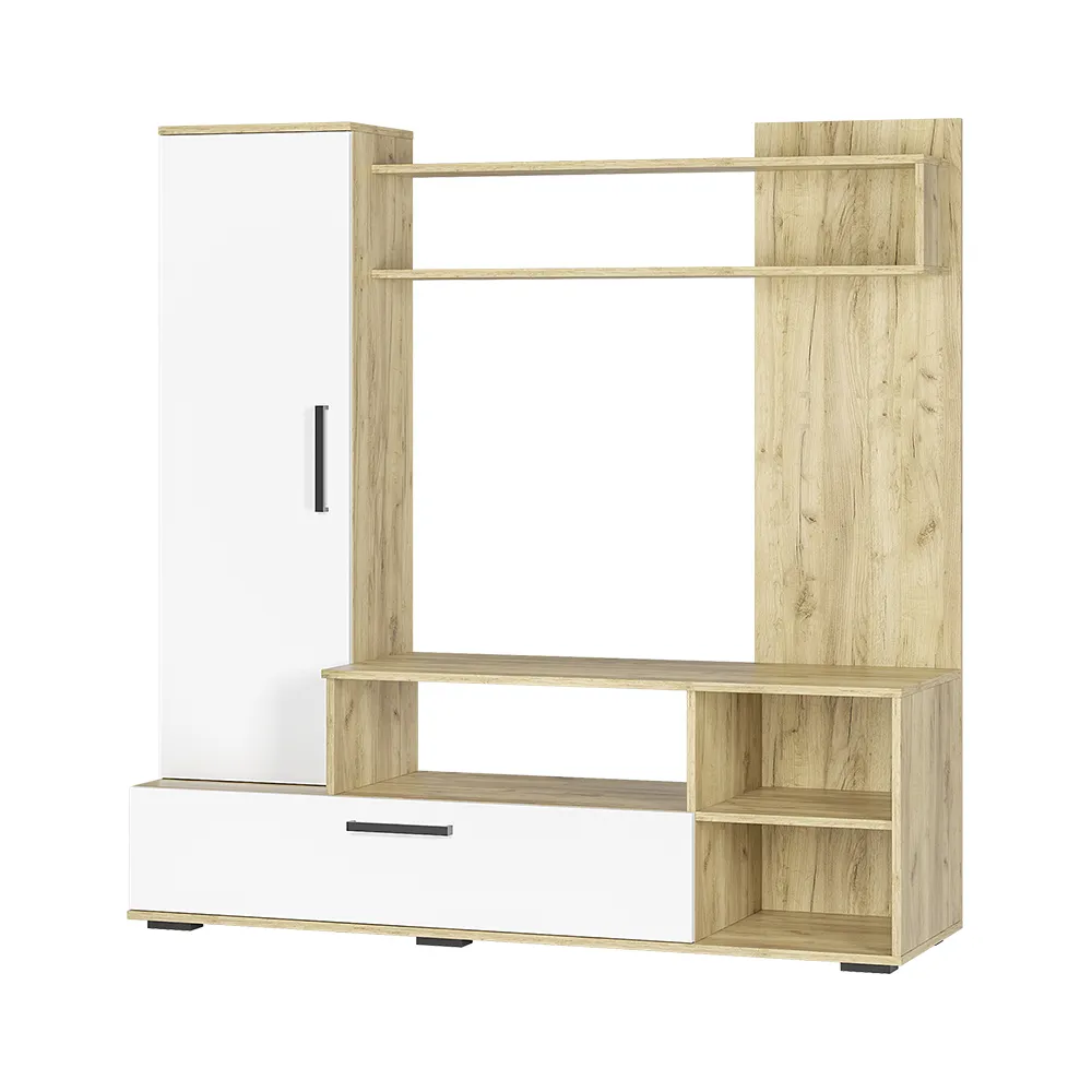 Большой модульный гарнитур изготовлен из прочного ЛДСП 16 мм и рассчитан на длительный срок эксплуатации. Просторная тумба под ТВ (1100*726*424 мм) соответствует современным стандартам. Подставка позволяет удобно разместить не только телевизор на стену диагональю до 48 дюймов, но и другую электронику, аудио- и видеоаппаратуру.
