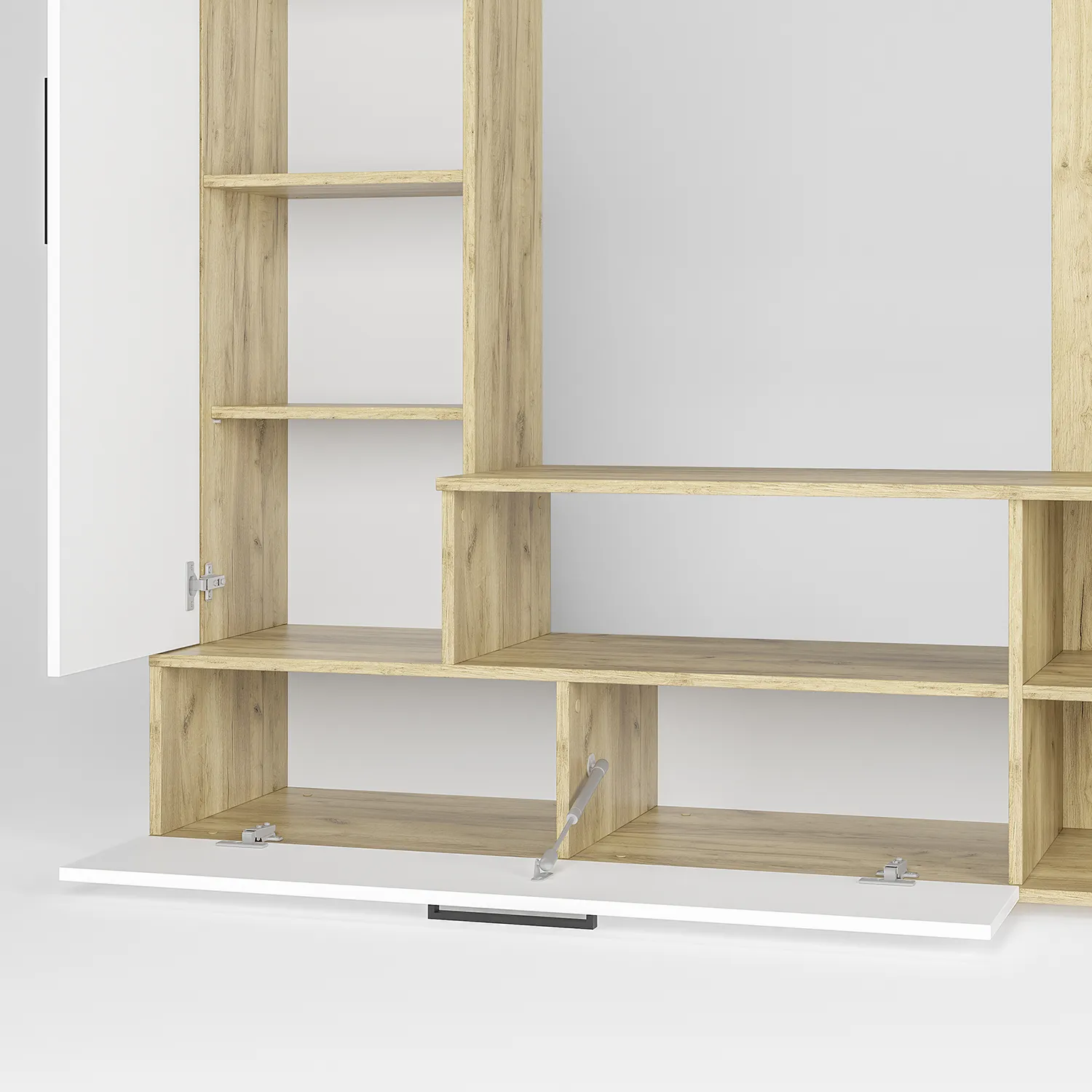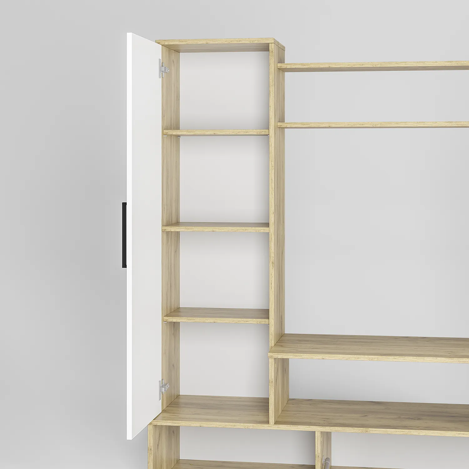 Напольный нижний закрытый ящик маленькой консоли оснащен секретерным кронштейном в сочетании с открытым небольшим стеллажом подходит для размещения книг, документов и развивающих материалов для детей, а также посуды и игрушек. На антресоли можно расставить декоративные элементы, фото и сувениры. В закрытый дверцами длинный шкаф пенал с накладными ручками 192 мм и четырьмя полками вы можете складывать одежду, постельное белье и других предметов домашнего обихода.
