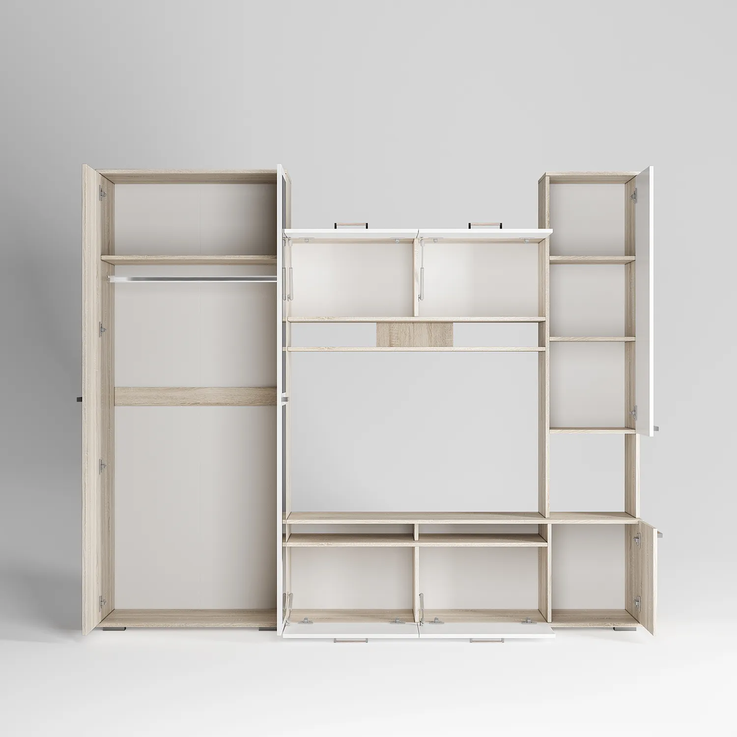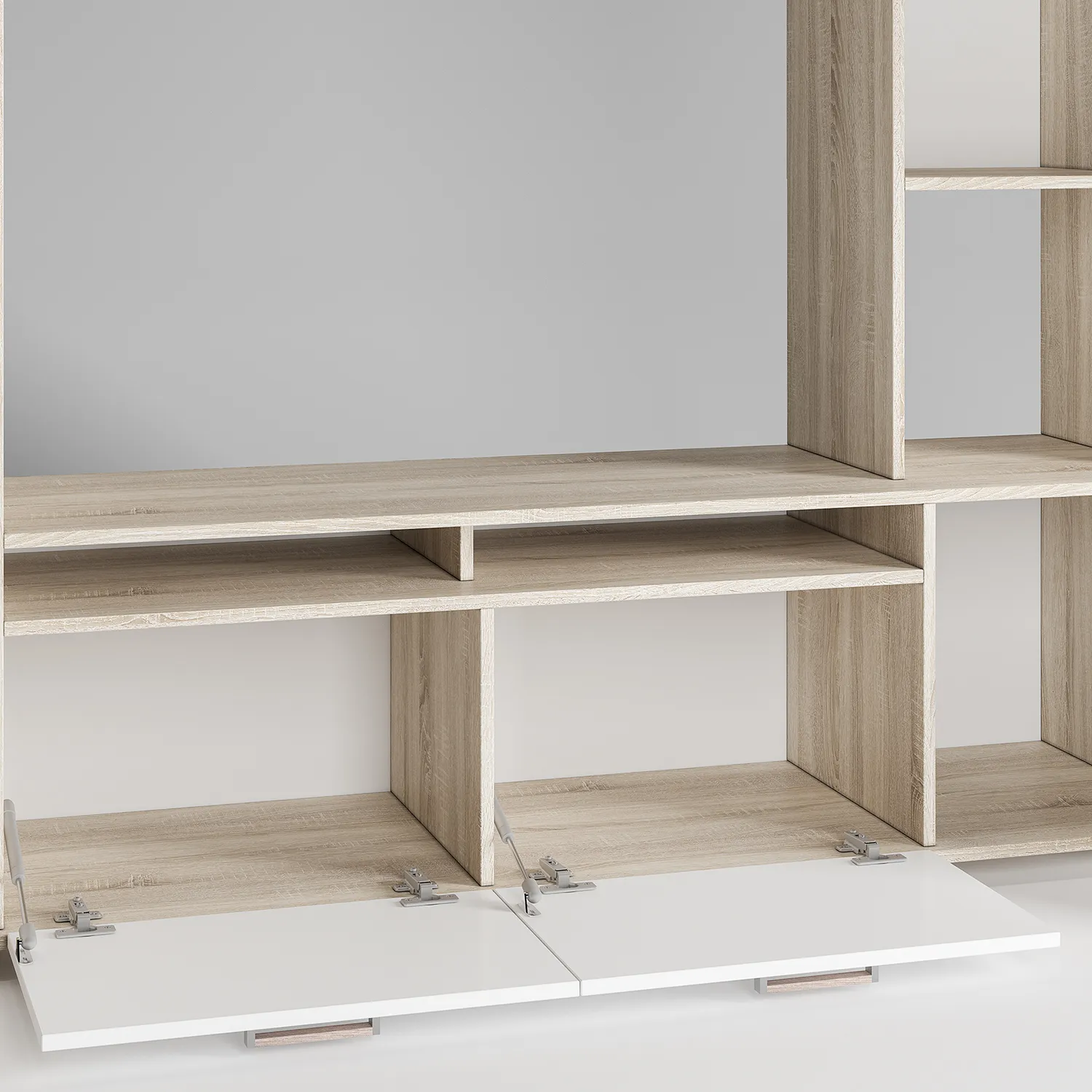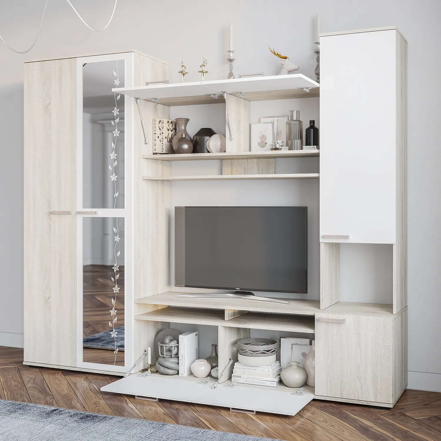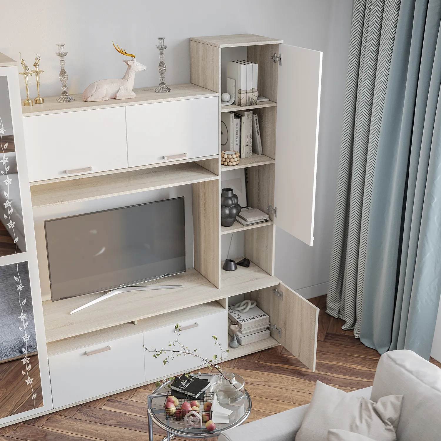 Стеллаж – модуль для телевизора с полками и дверцами обладает современным дизайном, который легко впишется в любой домашний интерьер — от минимализма и классики до скандинавского стиля.