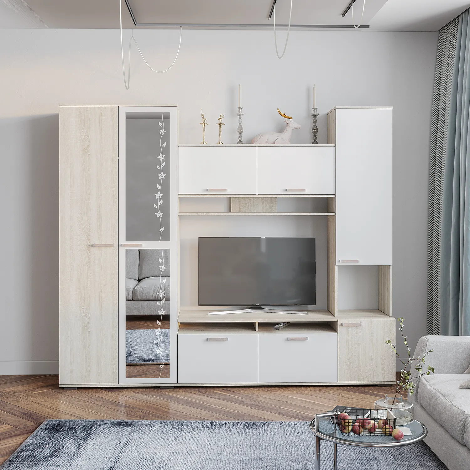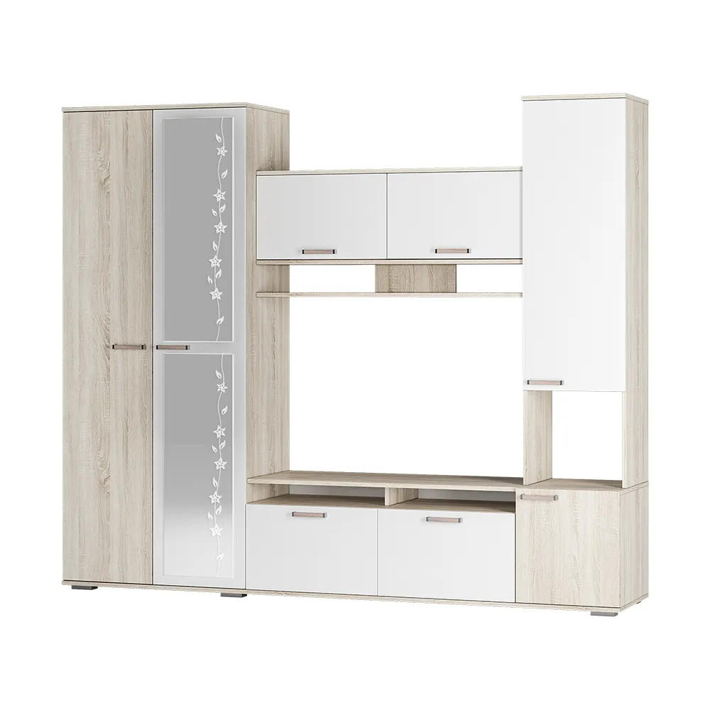 Большая гостиная с зеркалом "Лукас" — это готовое решение для создания стильного и функционального пространства в вашем доме или на даче. Гарнитур, выполненный в сочетании пастельного цвета дуб сонома и белого, добавляет лёгкости и света, визуально расширяя комнату.