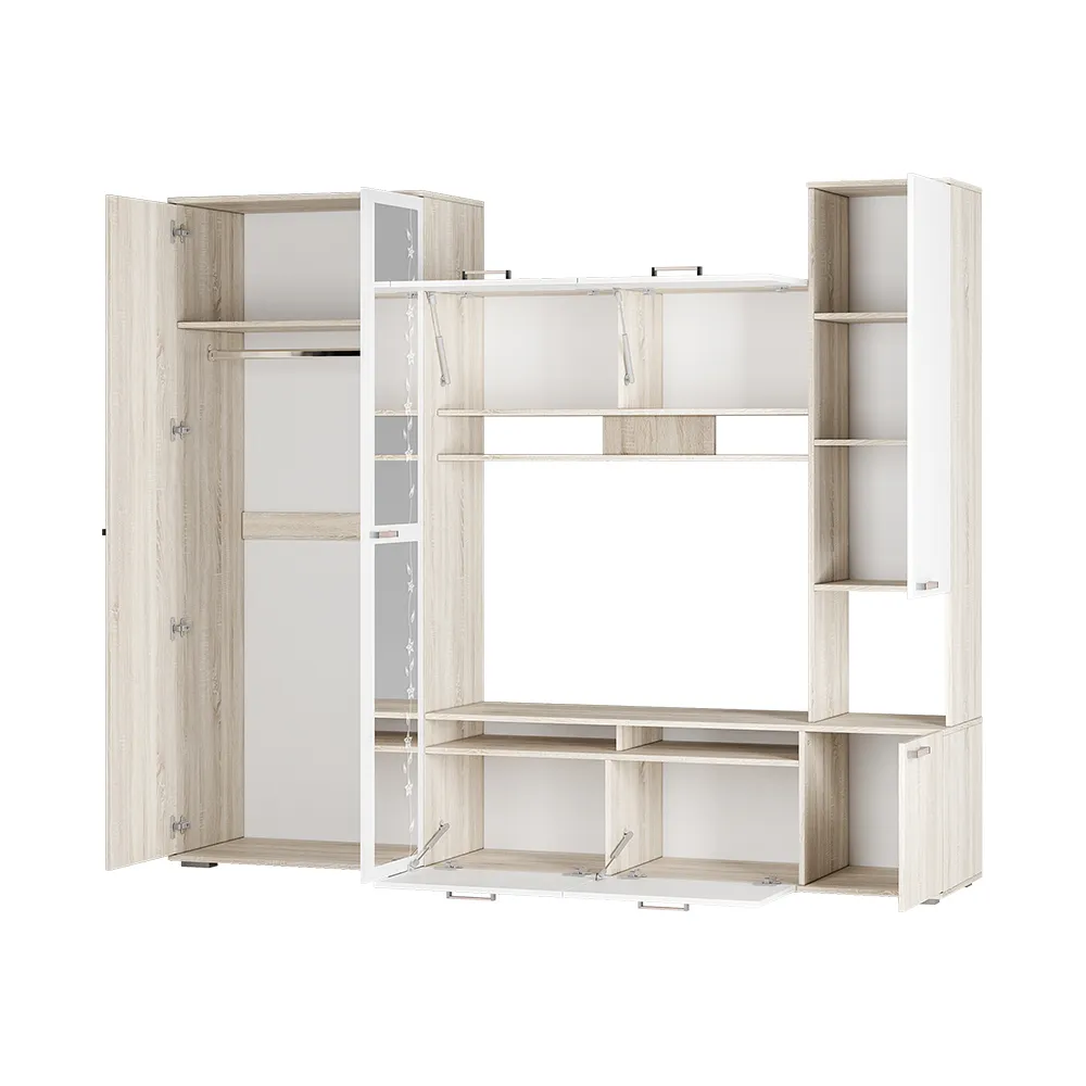 Размеры модульной мини стенки для зала или спальни из прочного ЛДСП (ширина - 230 см, высота - 194 см, глубина - 44 см) обеспечивают достаточное пространство для хранения вещей, что особенно важно при оформлении гардеробных систем в современных квартирах.