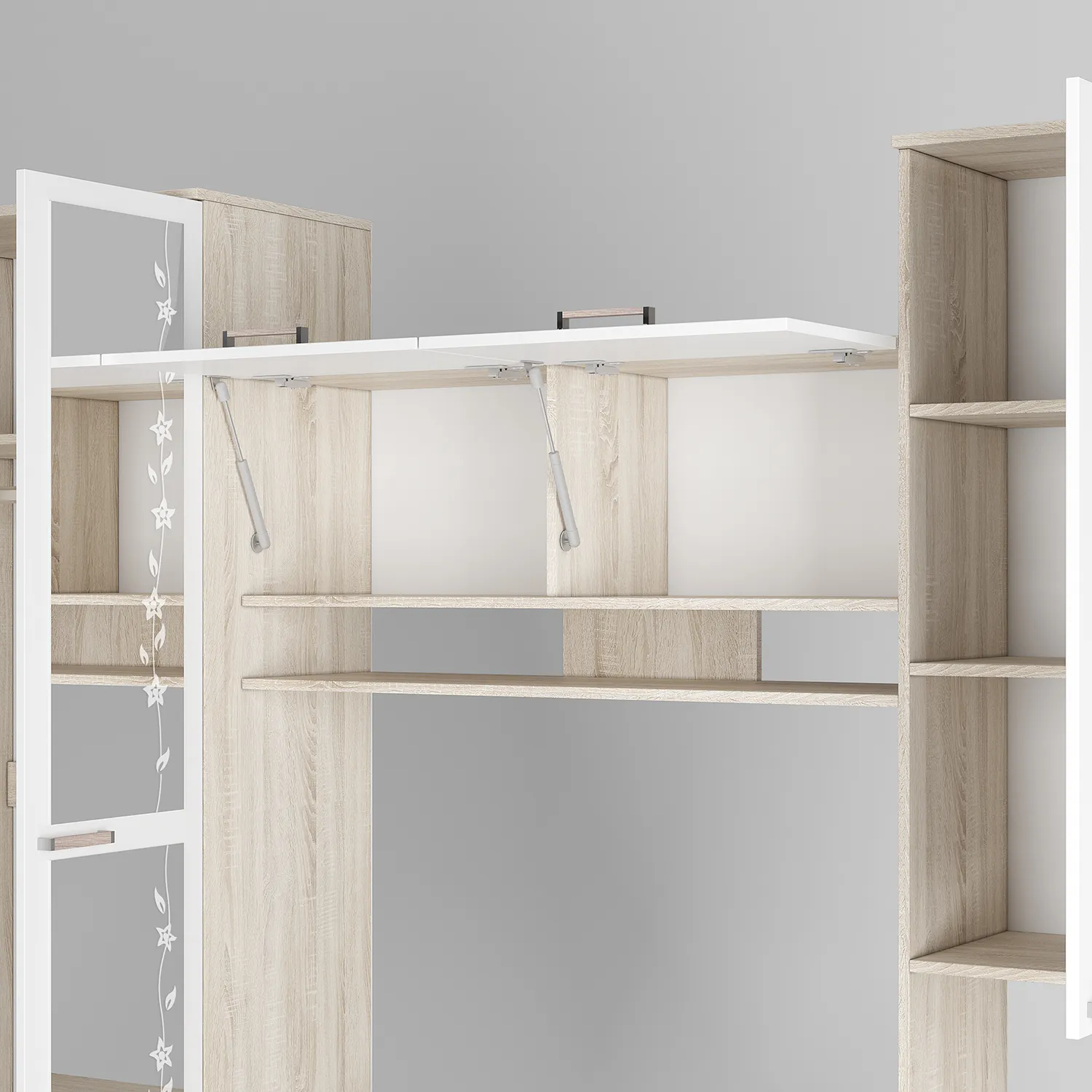 Высокий пенал горка заменит старый сервант, обеспечивая хранение сервизов и другой посуды. Закрытые ящики по периметру можно использовать в качестве органайзеров для размещения книг, детских игрушек и школьных принадлежностей. На антресоли и открытых полках предусмотрена площадь для расположения декора и сувениров, также цветов.