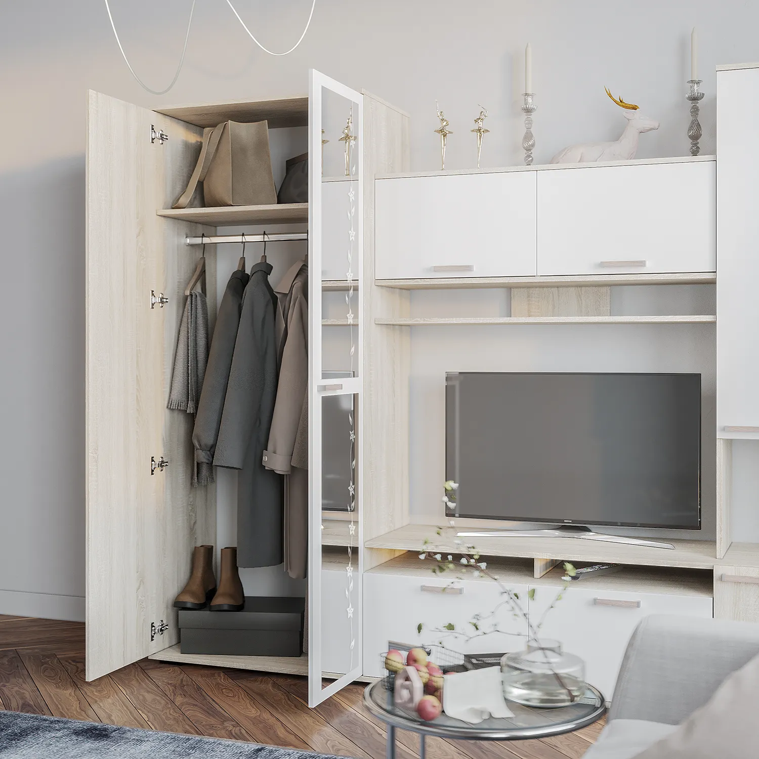 Двухстворчатый шкаф идеально подойдет для складирования белья, подушек и одеял. Мебельная штанга позволяет удобно развесить длинную одежду, предотвращая заломы на ткани. А декорированное зеркало в пол создано для примерок и создания стильных образов, а также для селфи и видео.