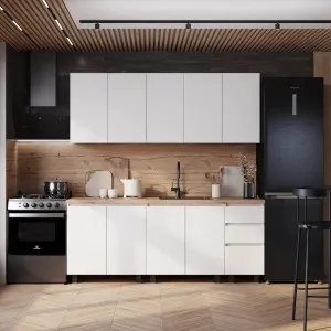 <virtues>Искал себе кухню по нормальной цене, наткнулся на эту. Стильная, белая, без ручек, я об них зацепаюсь. Немного подождал с доставкой, а так норм. Собирал сам после работы. Ещё много свободного места в шкафах.</virtues>