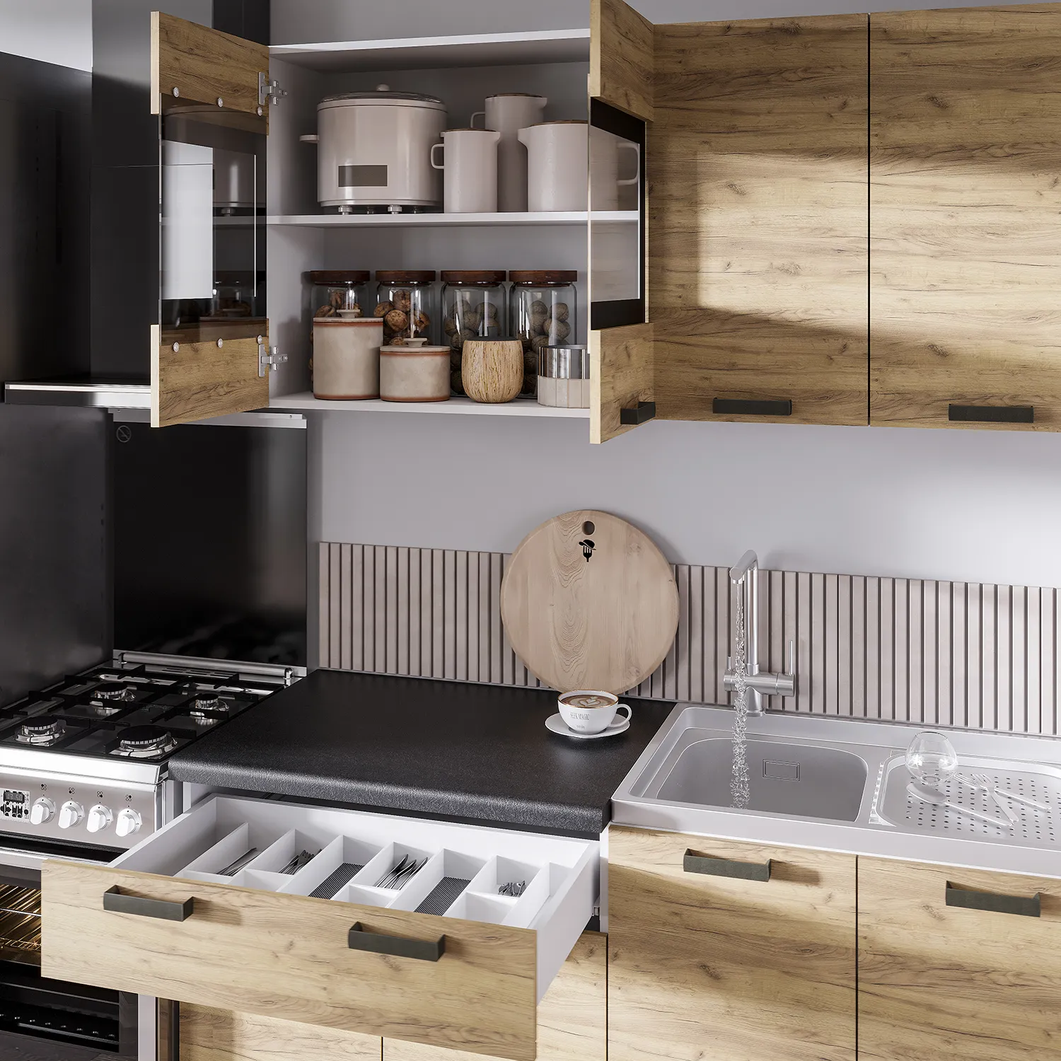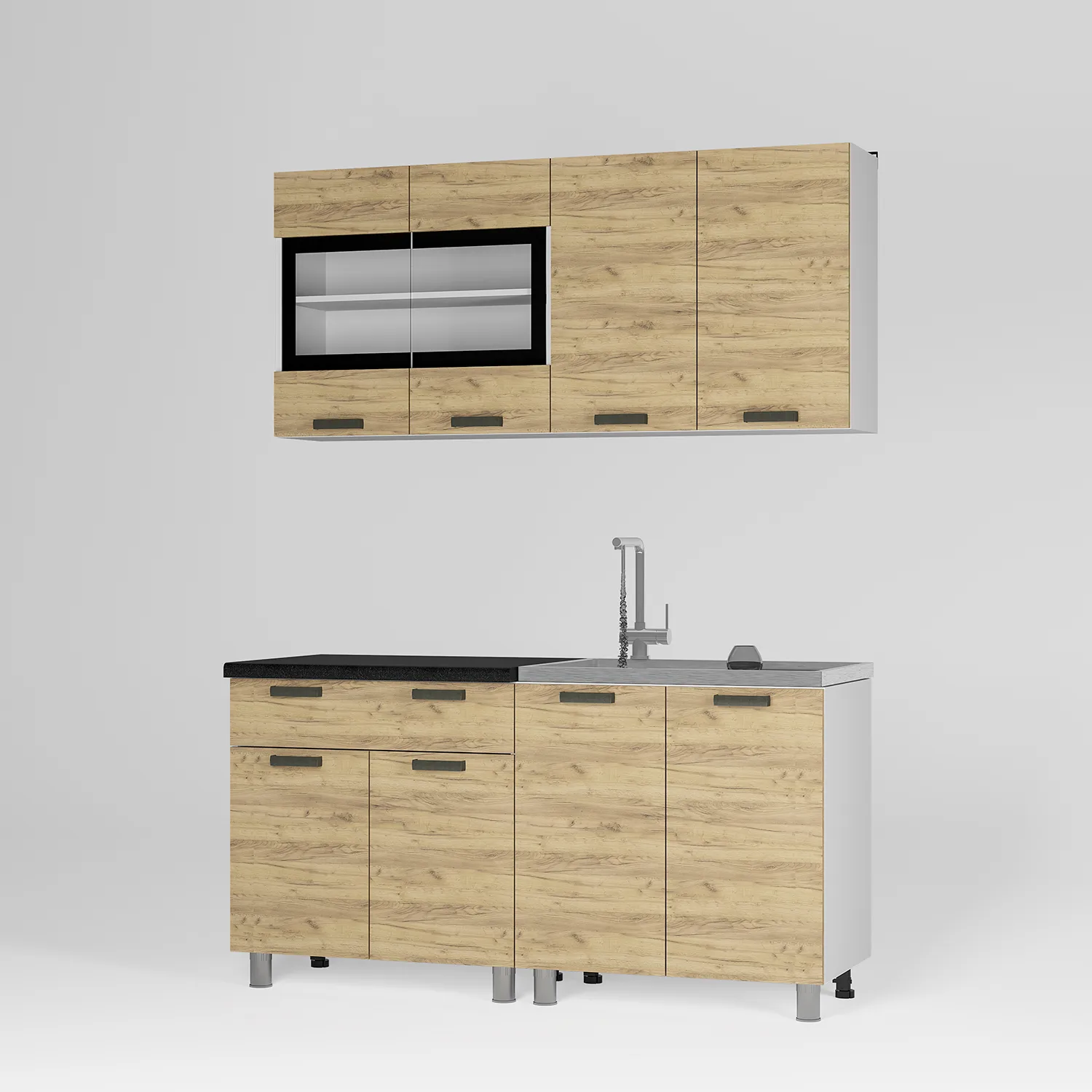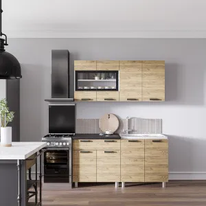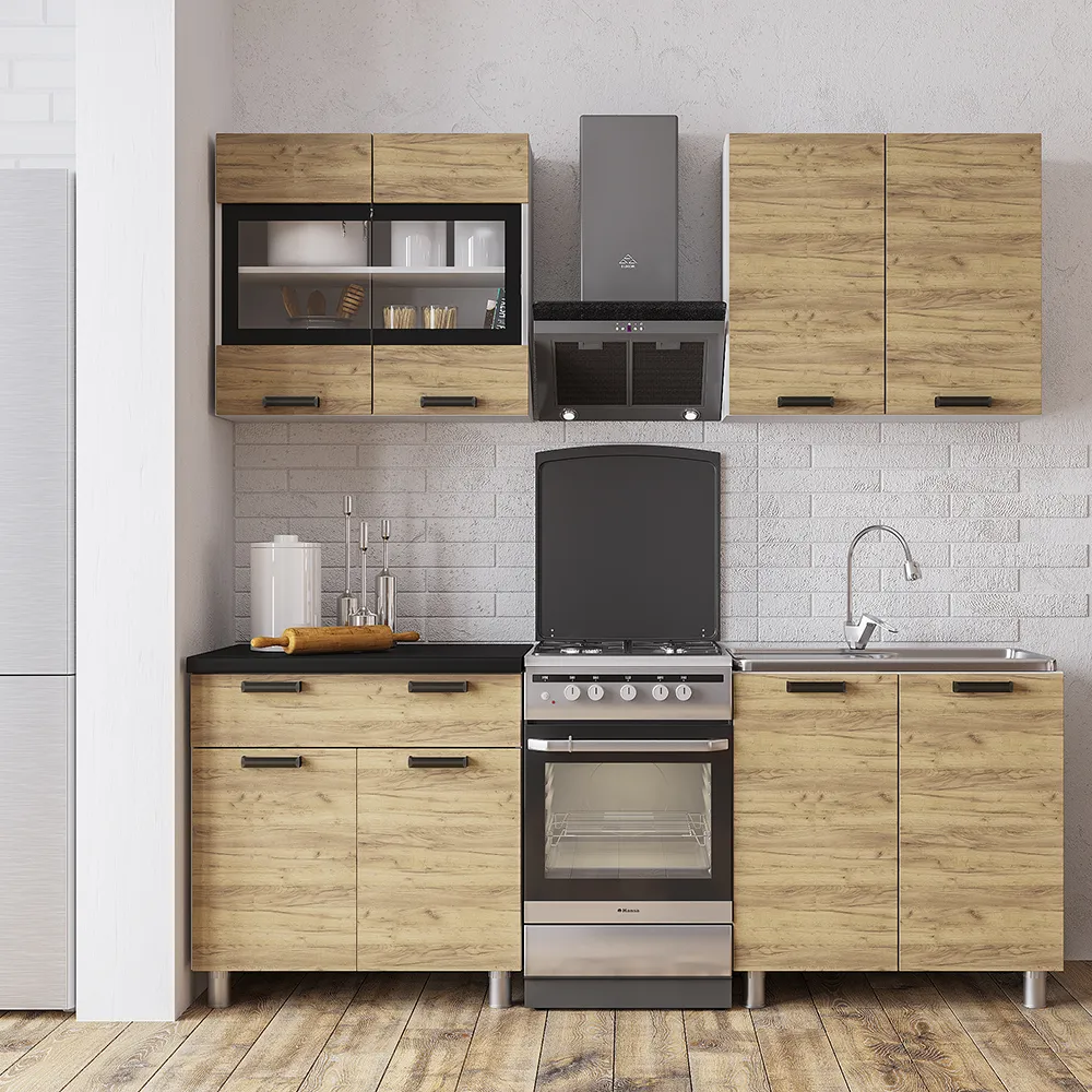 Модель оснащена всеми необходимыми нишами и полками для комфортного размещения посуды и продуктов. Гарнитур выполнен из высококачественной ЛДСП с фасадами в цвете "дуб крафт золотой" и дополнен стильными черными ручками. Часть верхних шкафов имеют стеклянные вставки, что облегчает всю конструкцию.