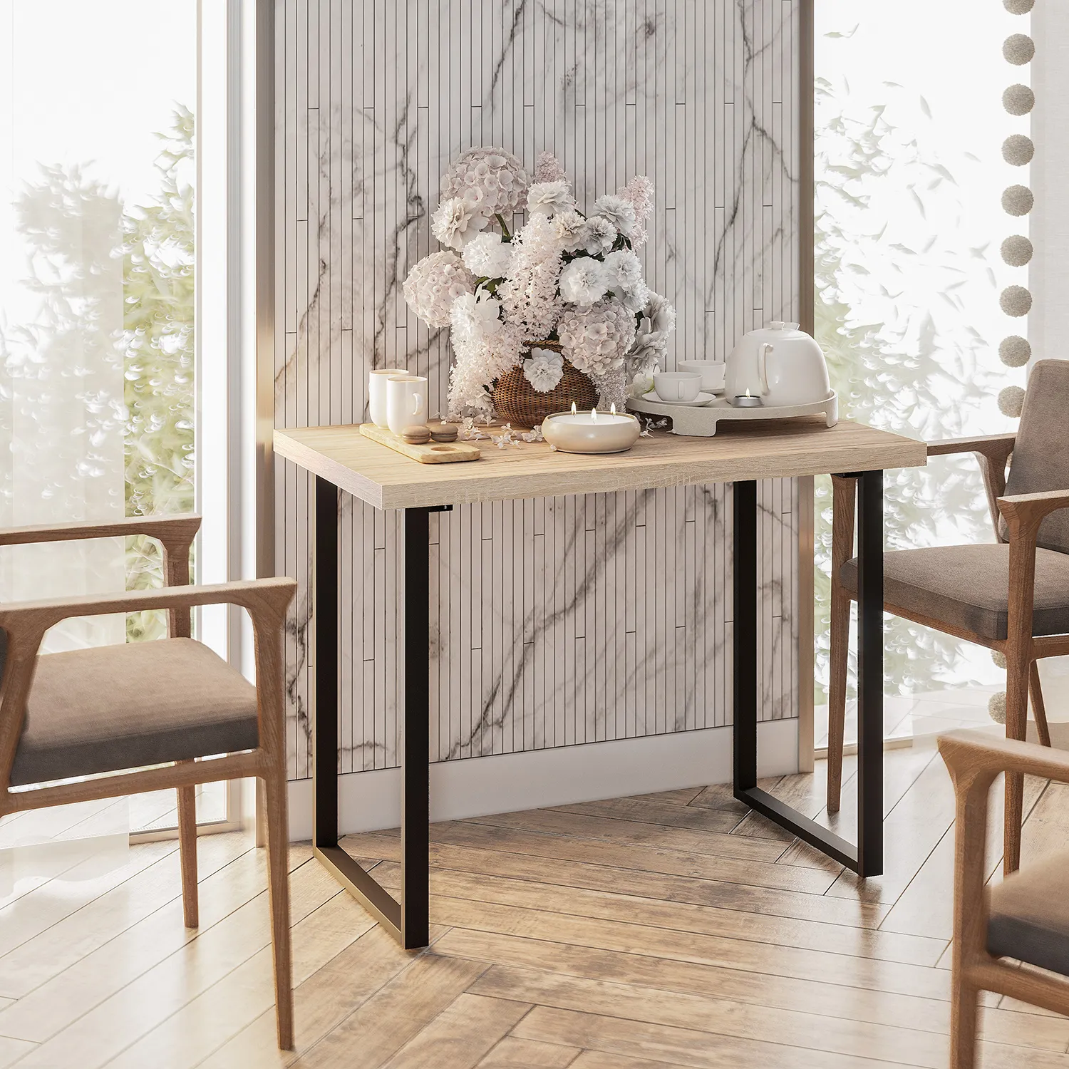 Стол "Дарк" - современная модель в стиле "лофт". Благодаря лаконичному дизайну этот стол идеально впишется с интерьер домашнего офиса или кухни. Квадратные черные опоры из металла отличаются прочностью и устойчивостью к повреждениям. На столешнице, имитирующей текстуру дерева, можно с комфортом разместить различные необходимые предметы.