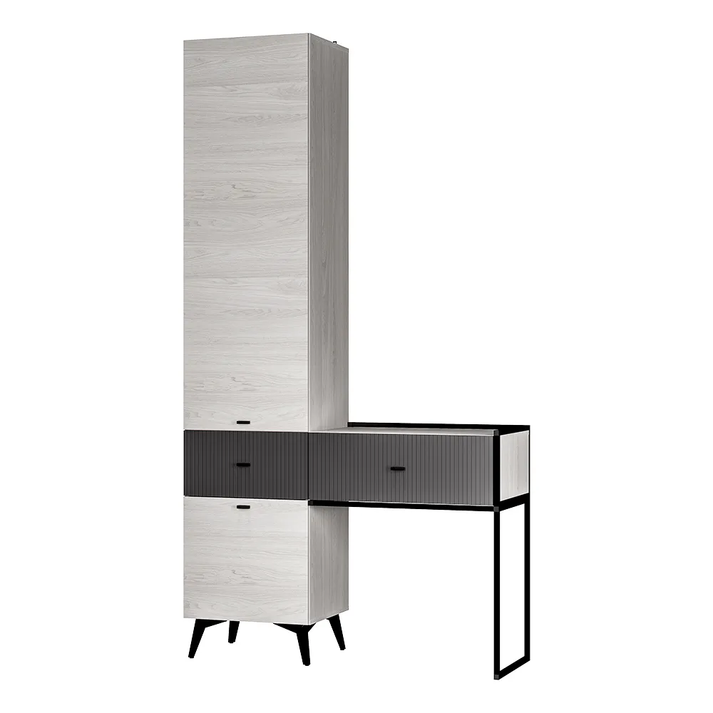 Прихожая «Норд» — это прекрасный образец современной роскоши в дизайне интерьера. Модель состоит из двух основных блоков, переплетающихся друг с другом и создающих единую композицию. Металлические детали не только усиливают конструкцию, но и являются яркими акцентами в дизайне прихожей.