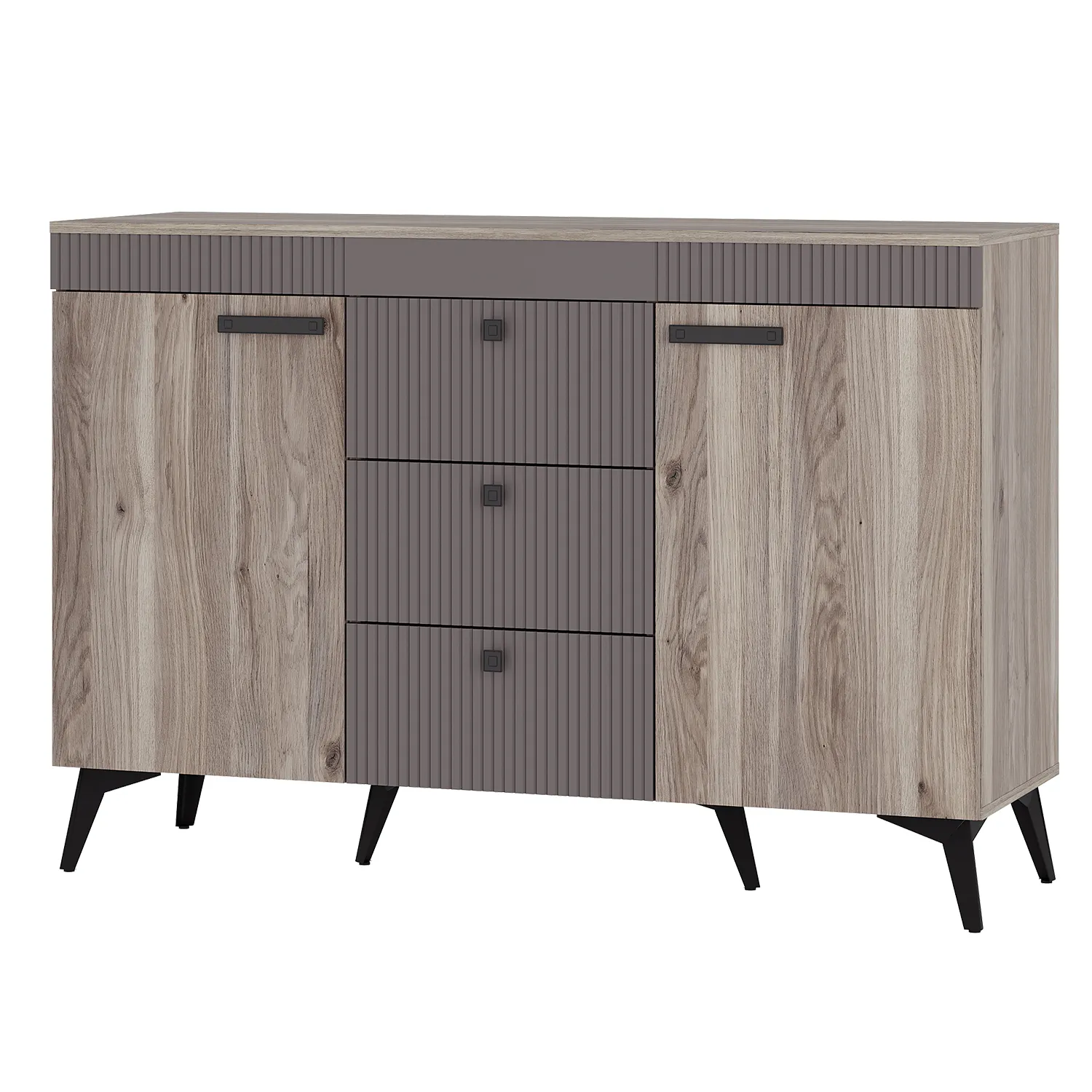 Комод «Кассандра» состоит из трёх вместительных зон: 2 боковые зоны с полками, а центральная состоит из трёх ящиков, в которых удобно хранить постельное бельё и мелочи.