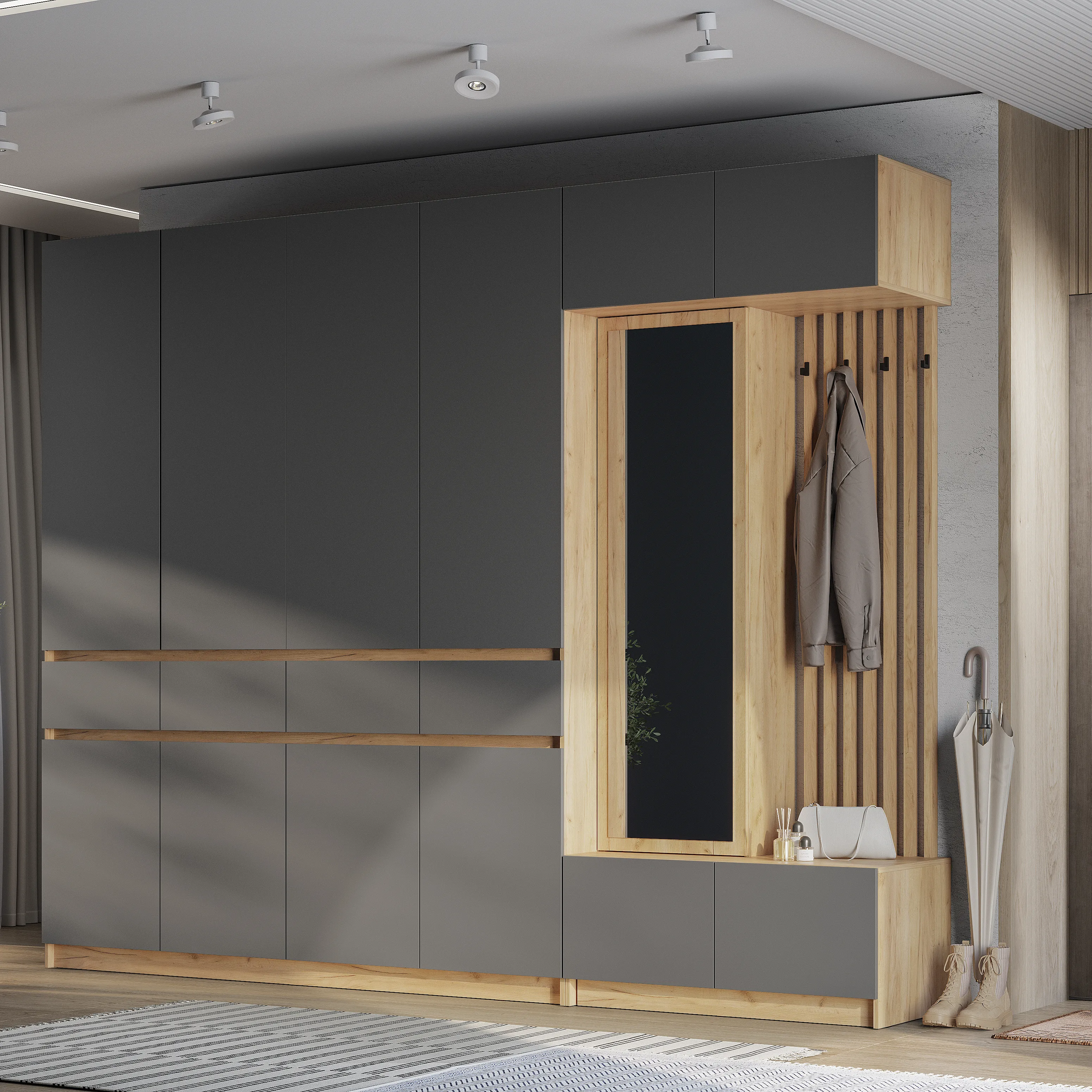 Стильная и компактная прихожая «Багира» – это оптимальное сочетание открытых и закрытых зон для хранения верхней одежды, головных уборов, обуви и аксессуаров.
