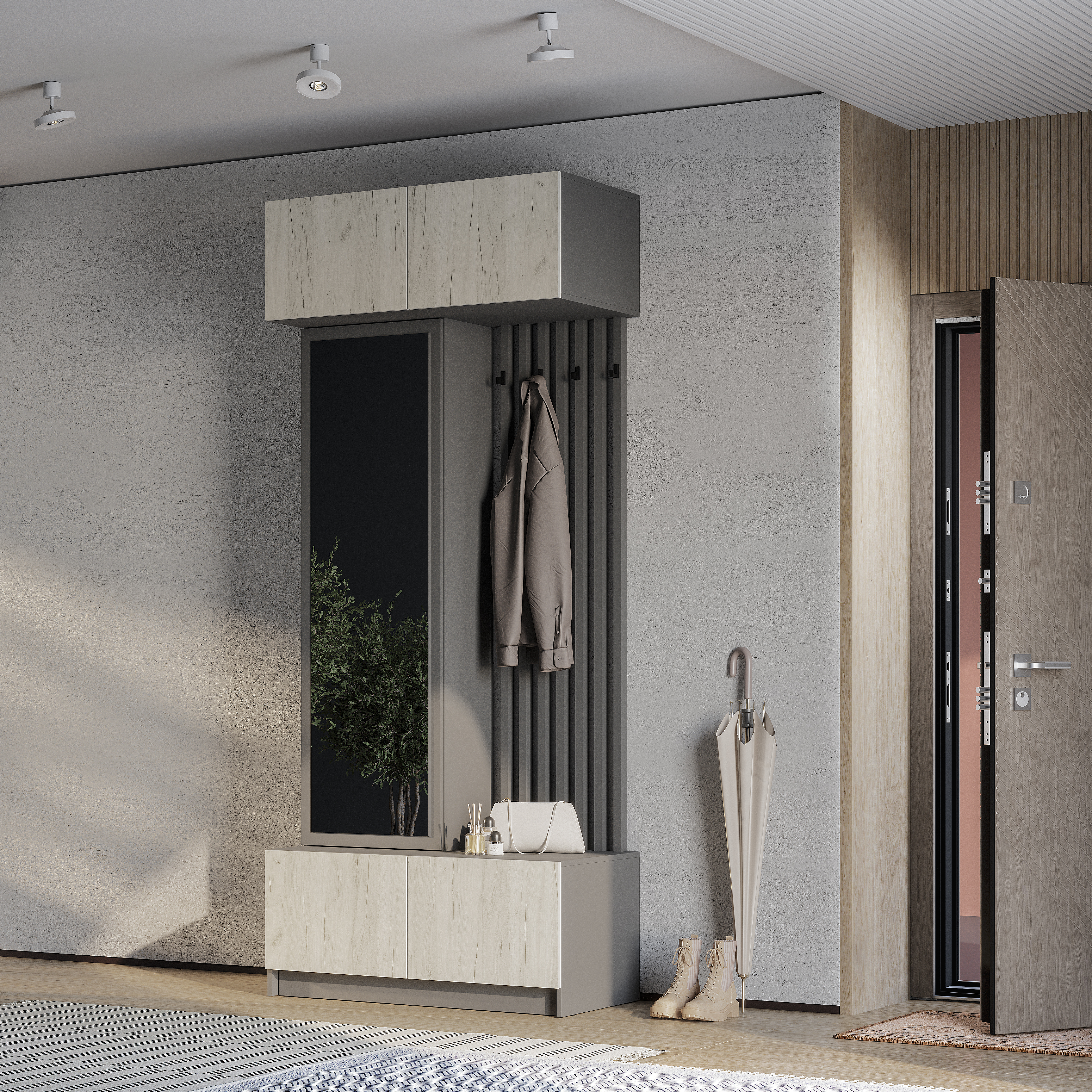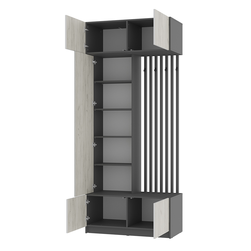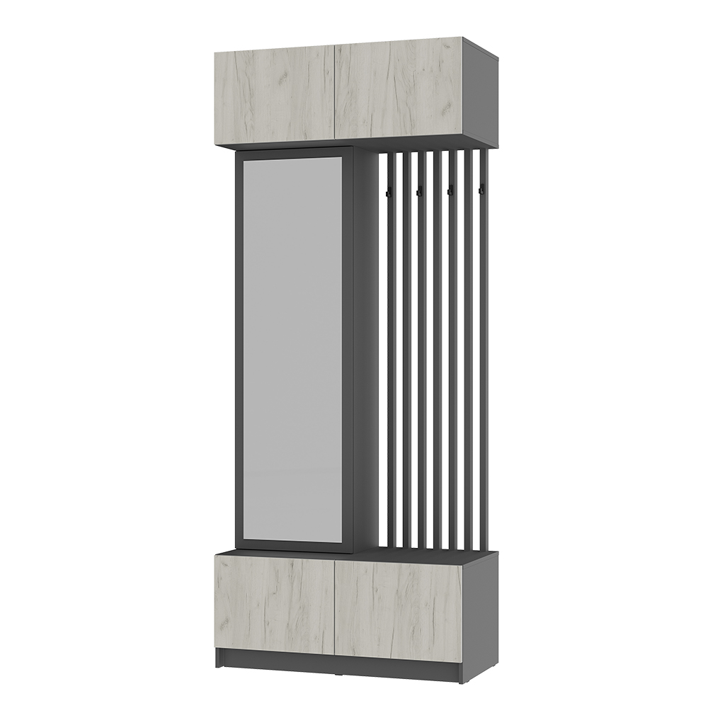 Стильная и компактная прихожая «Багира» – это оптимальное сочетание открытых и закрытых зон для хранения верхней одежды, головных уборов, обуви и аксессуаров.