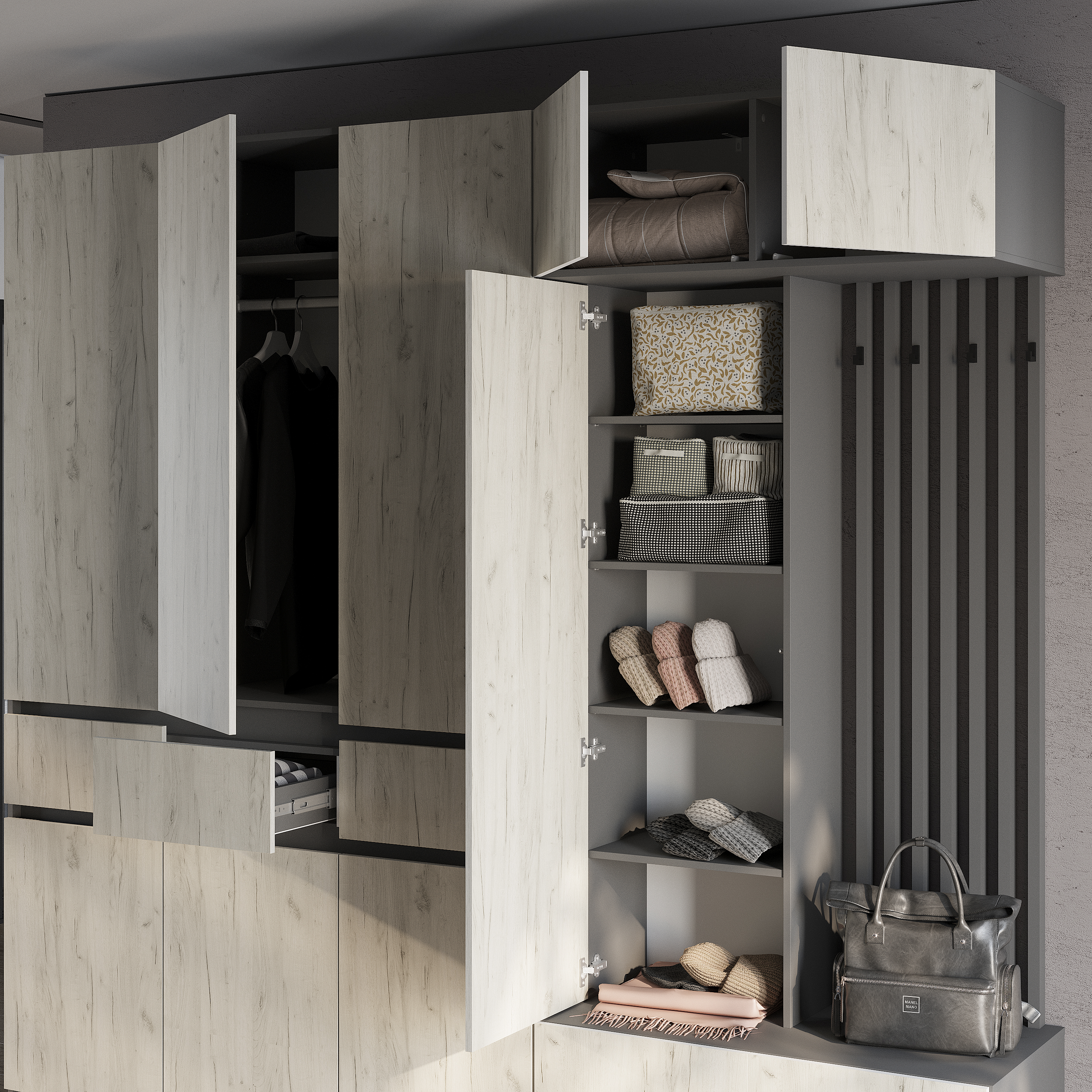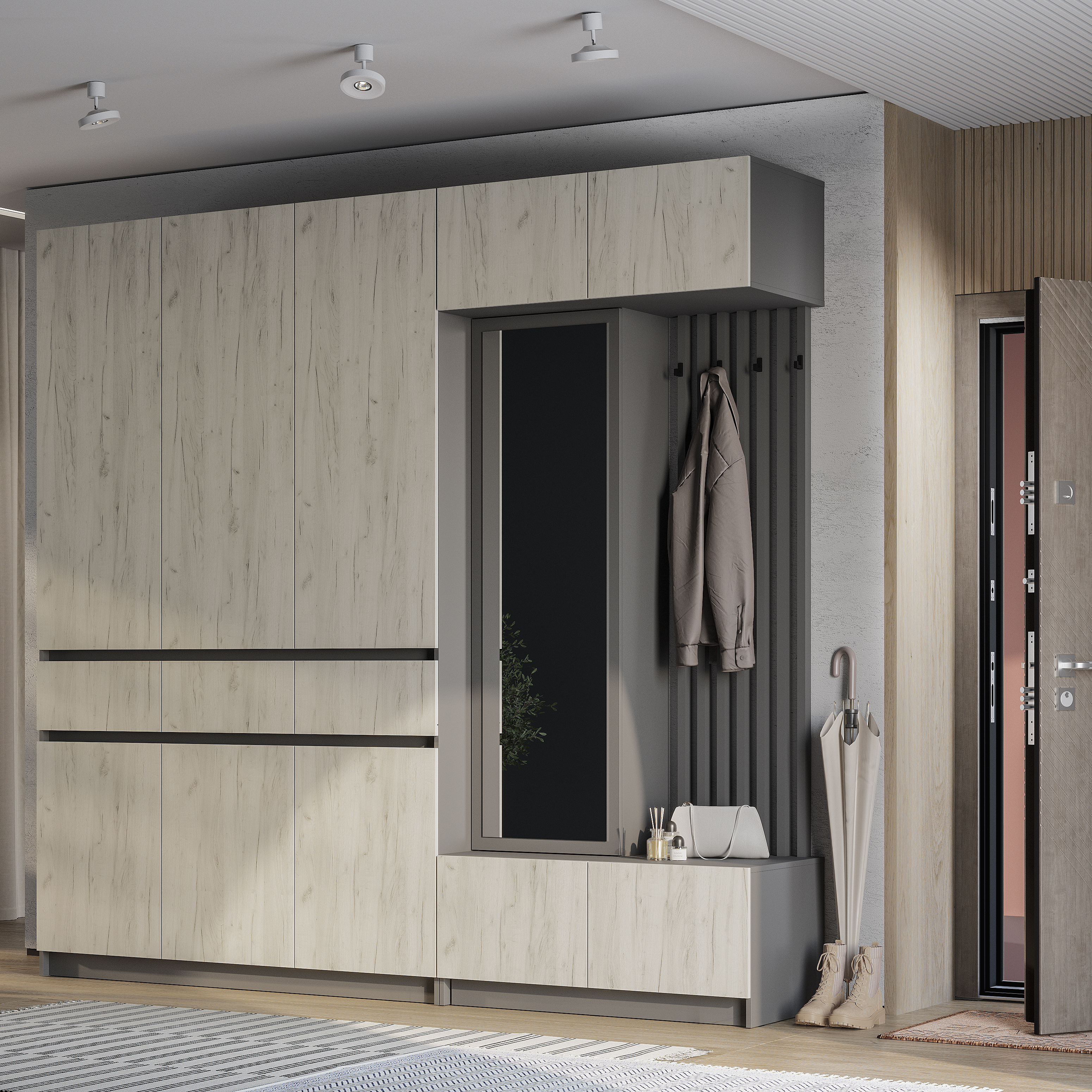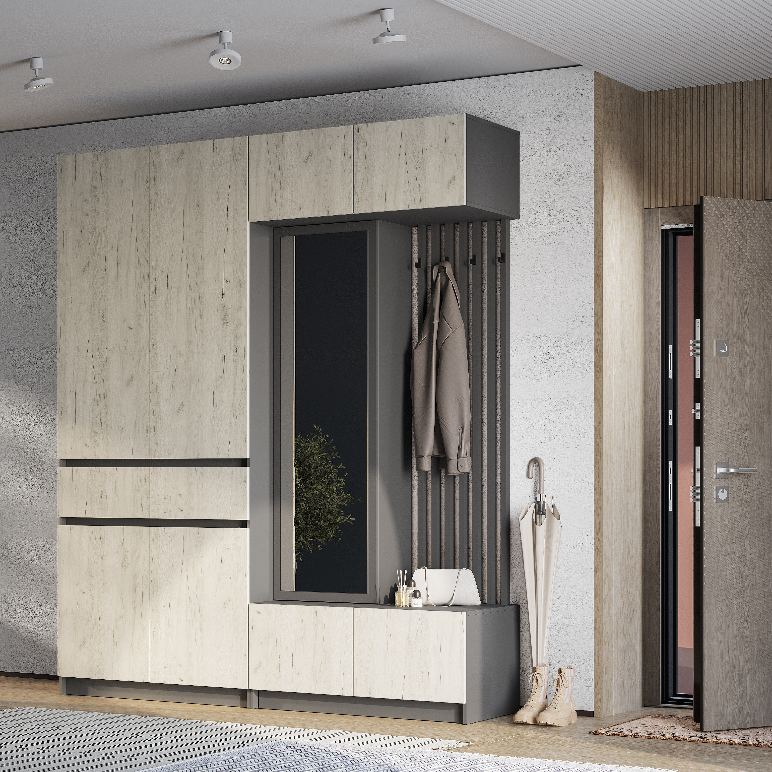 Стильная и компактная прихожая «Багира» – это оптимальное сочетание открытых и закрытых зон для хранения верхней одежды, головных уборов, обуви и аксессуаров.