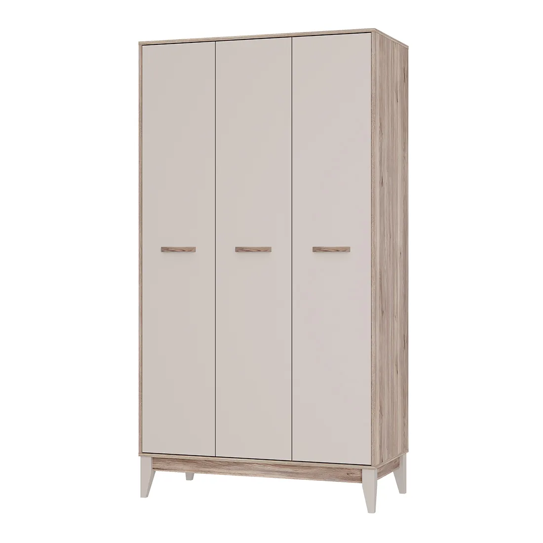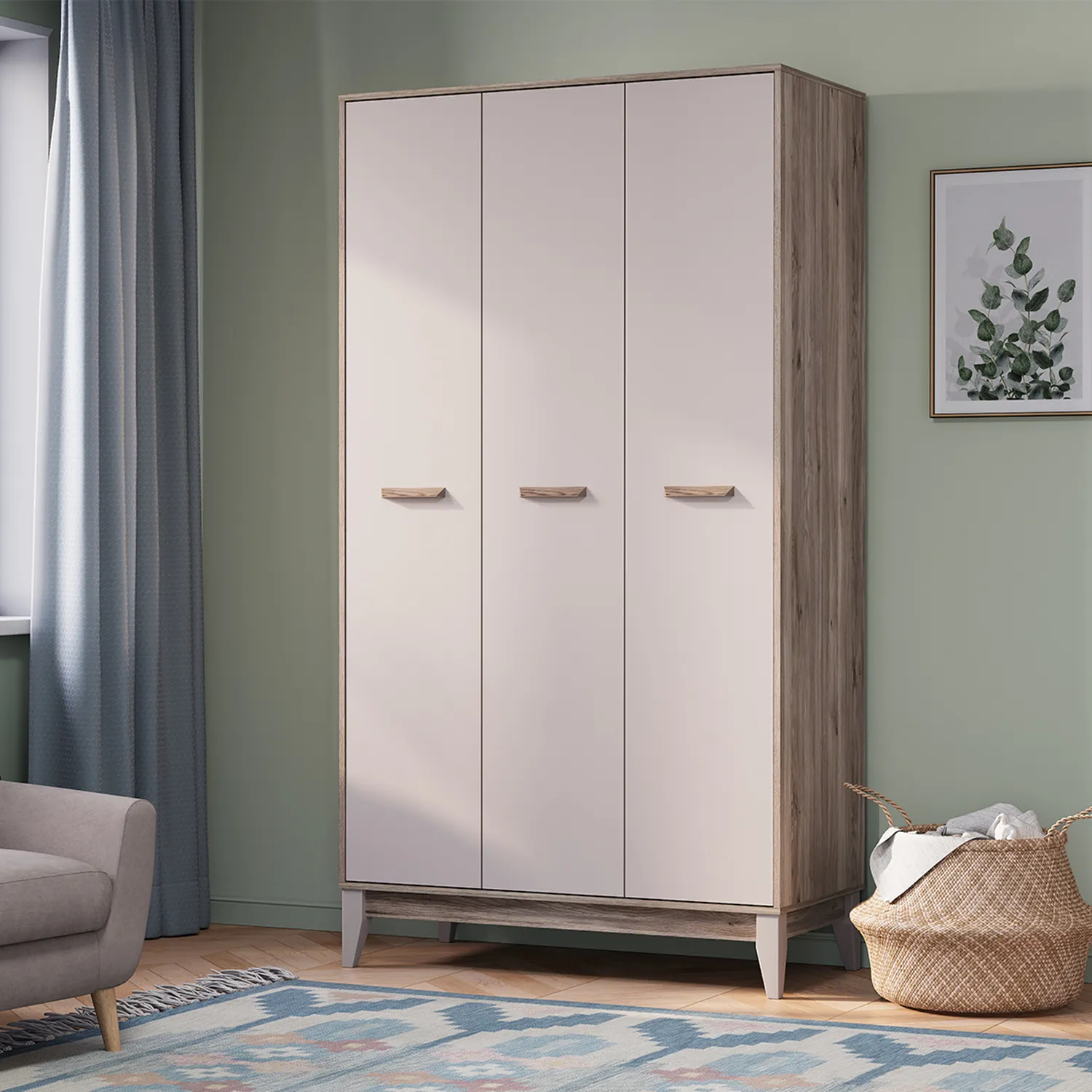 Трехстворчатый шкаф «Скандика» дополнит другие модули коллекции или впишется в готовый интерьер. Светлые оттенки и минималистичный дизайн делают эту модель универсальной. Шкаф «Скандика» станет удобным и комфортным пространством для ваших любимых вещей. За одной дверцей размещены две просторные открытые полки и секция с надежной хромированной штангой для вертикального хранения, а за другой – шесть открытых полок.