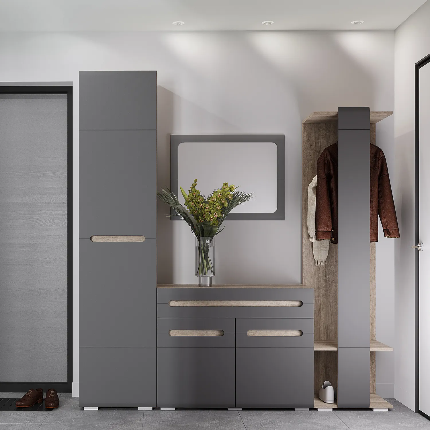 Модульная коллекция «Наоми» – это стильное современное решение в контрастном сочетании корпуса «дуб каньон» с элегантным матовым фасадом насыщенного грифельного оттенка. Оригинальное конструктивное решение коллекции – ручки фасадов, выполненные путем сложной фрезеровки с максимально реалистичным декором дубового спила.