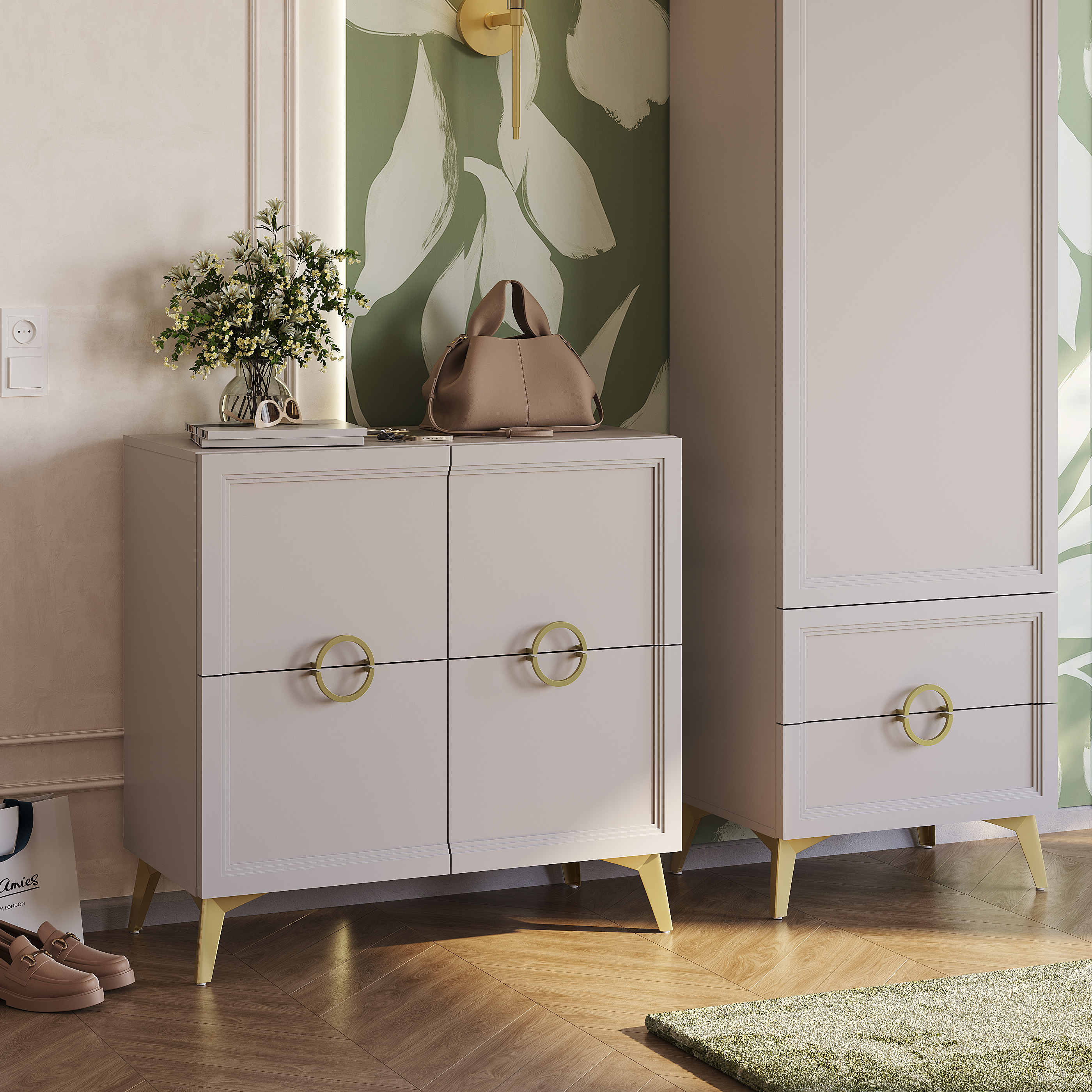 Фасады выполнены из ЛДСП в цвете «кашемир» толщиной 16 мм, а по краям фасады облицованы рамочным профилем из МДФ с рельефной фрезеровкой толщиной 26 мм.