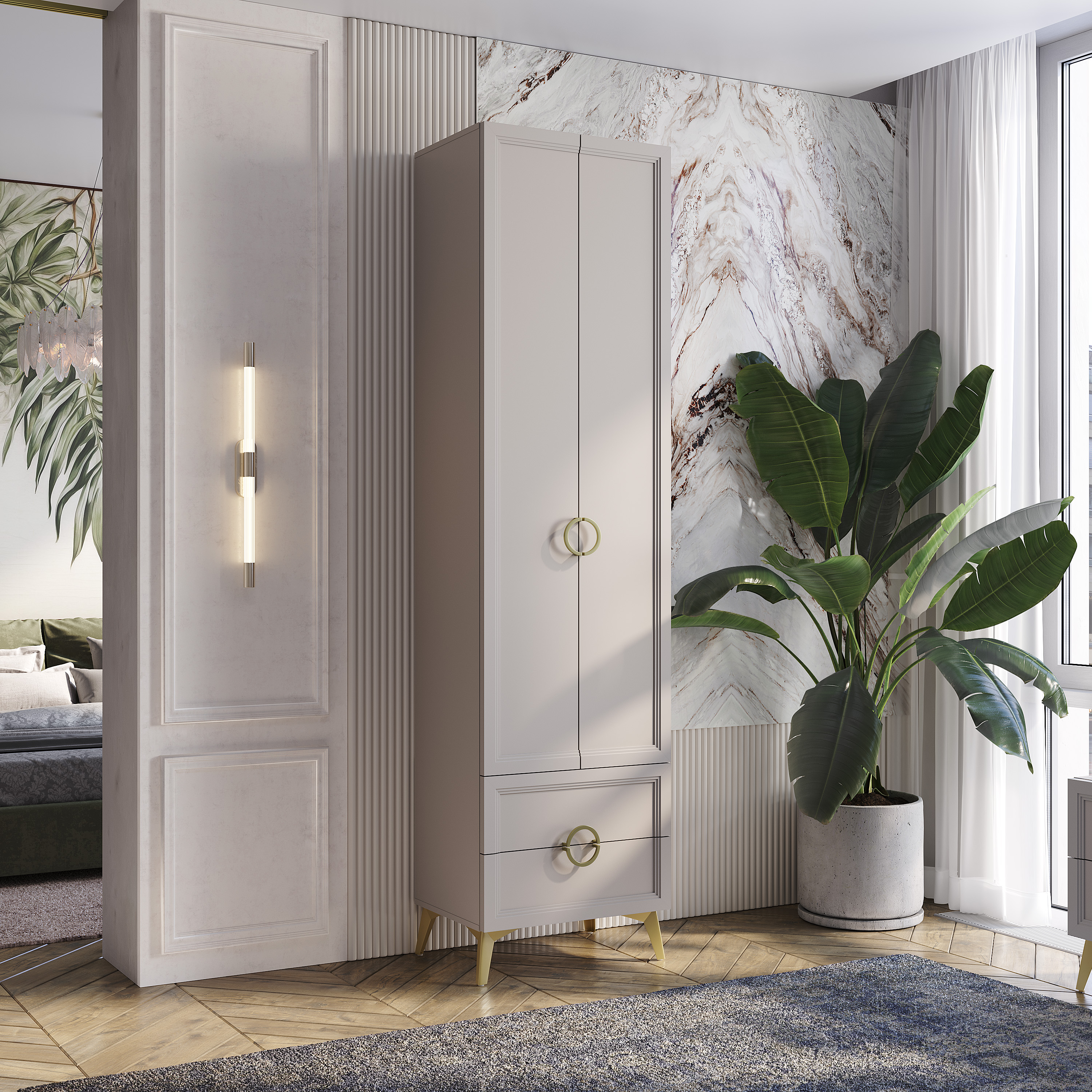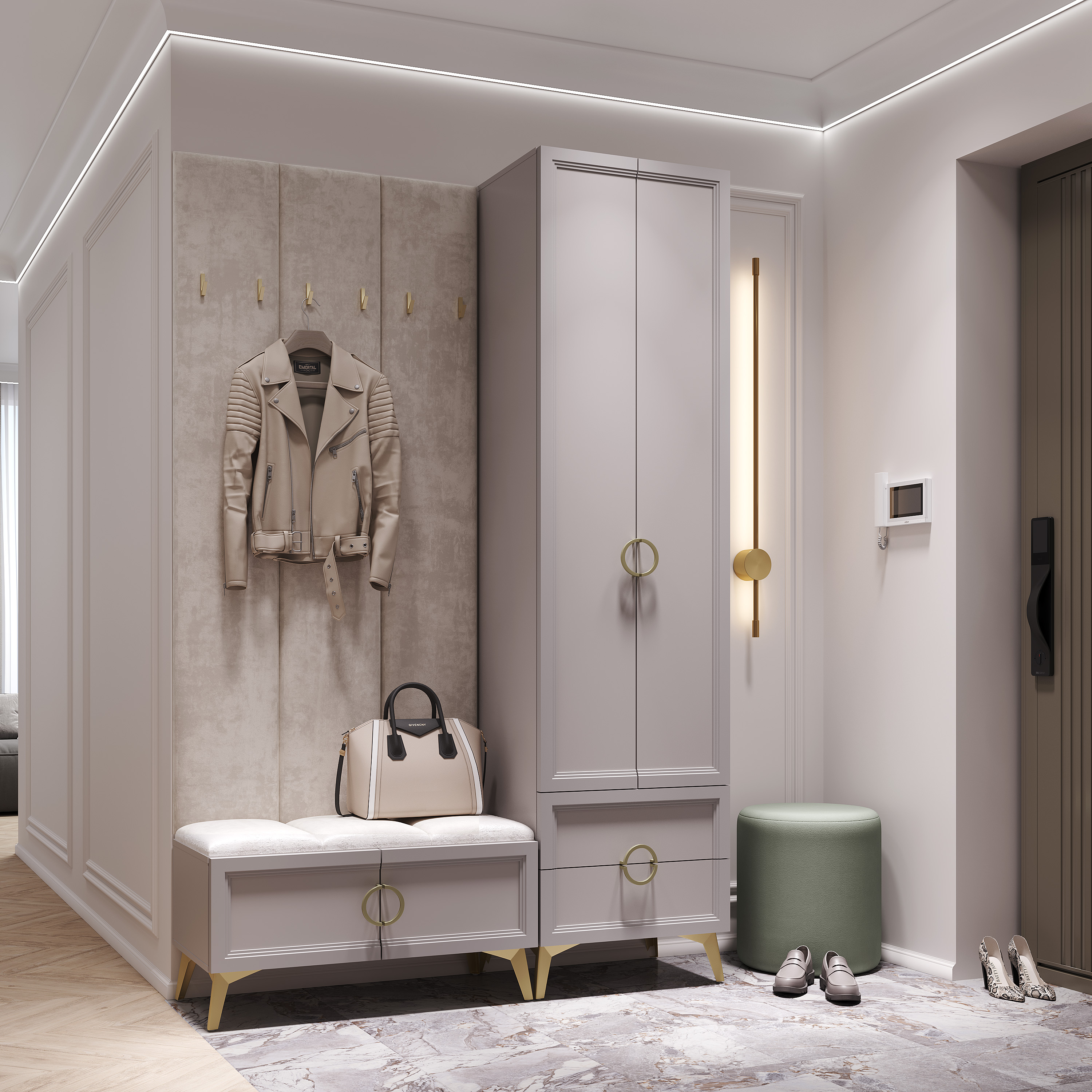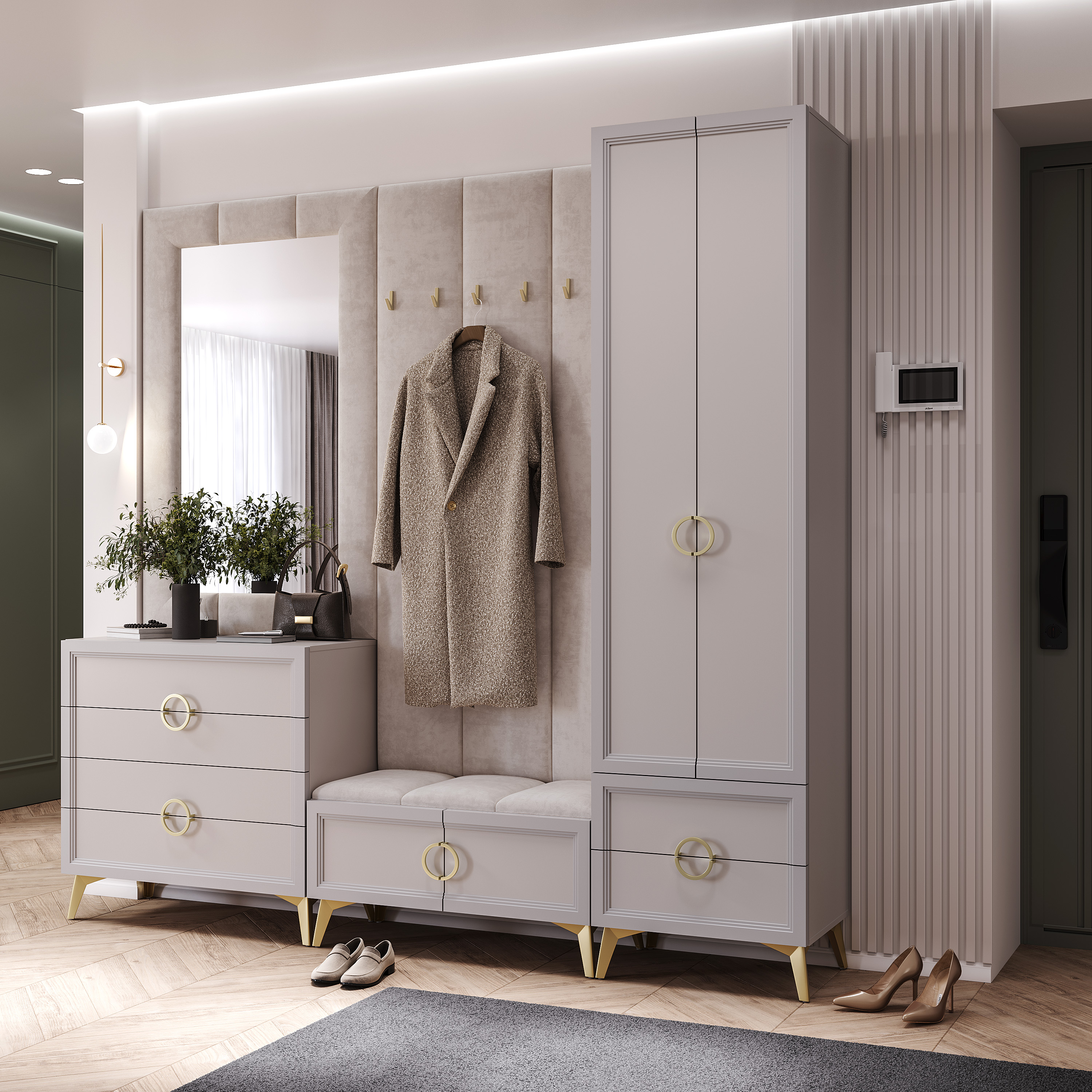 Фасады выполнены из ЛДСП в цвете «кашемир» толщиной 16 мм, а по краям фасады облицованы рамочным профилем из МДФ с рельефной фрезеровкой толщиной 26 мм.