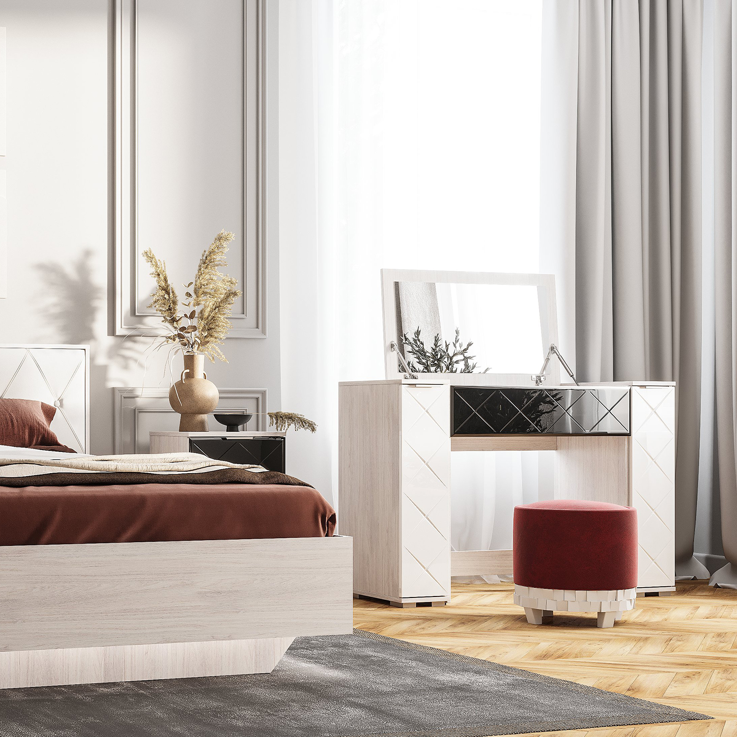 белые глянцевые фасады с уникальной вставкой из стекла лакобель чёрного цвета с фацетом добавляют моделям особые нотки роскоши и шарма.