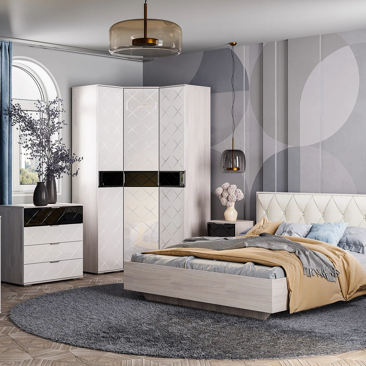 Модульная спальня «Кимберли» - это современная элегантная мебель с остроконечной фрезеровкой фасадов. Корпус выполнен в цвете "ясень белый";
