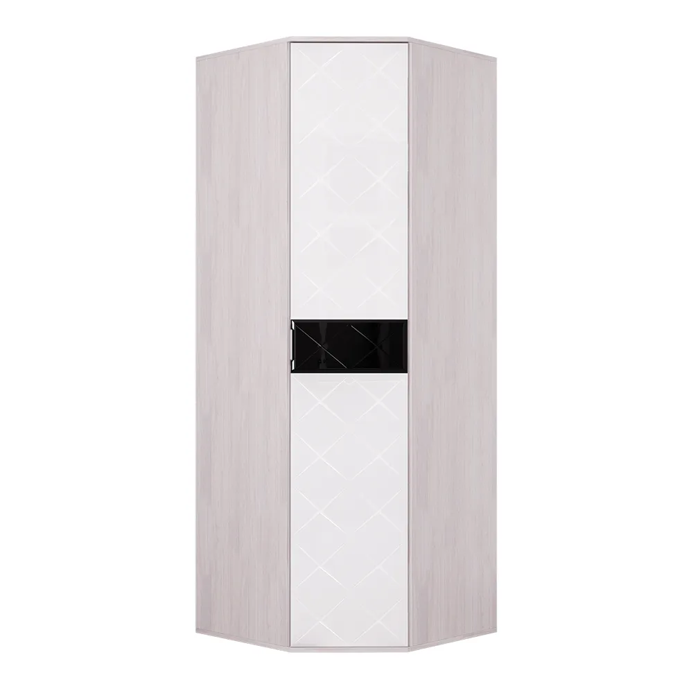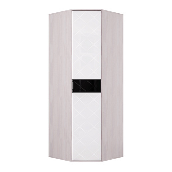 Красивая модель углового шкафа "Кимберли" выполнена из светлой ЛДСП цвета "ясень белый". Фасад распашной дверцы сделан в стиле всей одноимённой коллекции и имеет декоративный фацет и гравировку. Внутри модель разделена на две зоны: для одежды на плечиках предусмотрена хромированная штага, а для других вещей – вместительные полки.