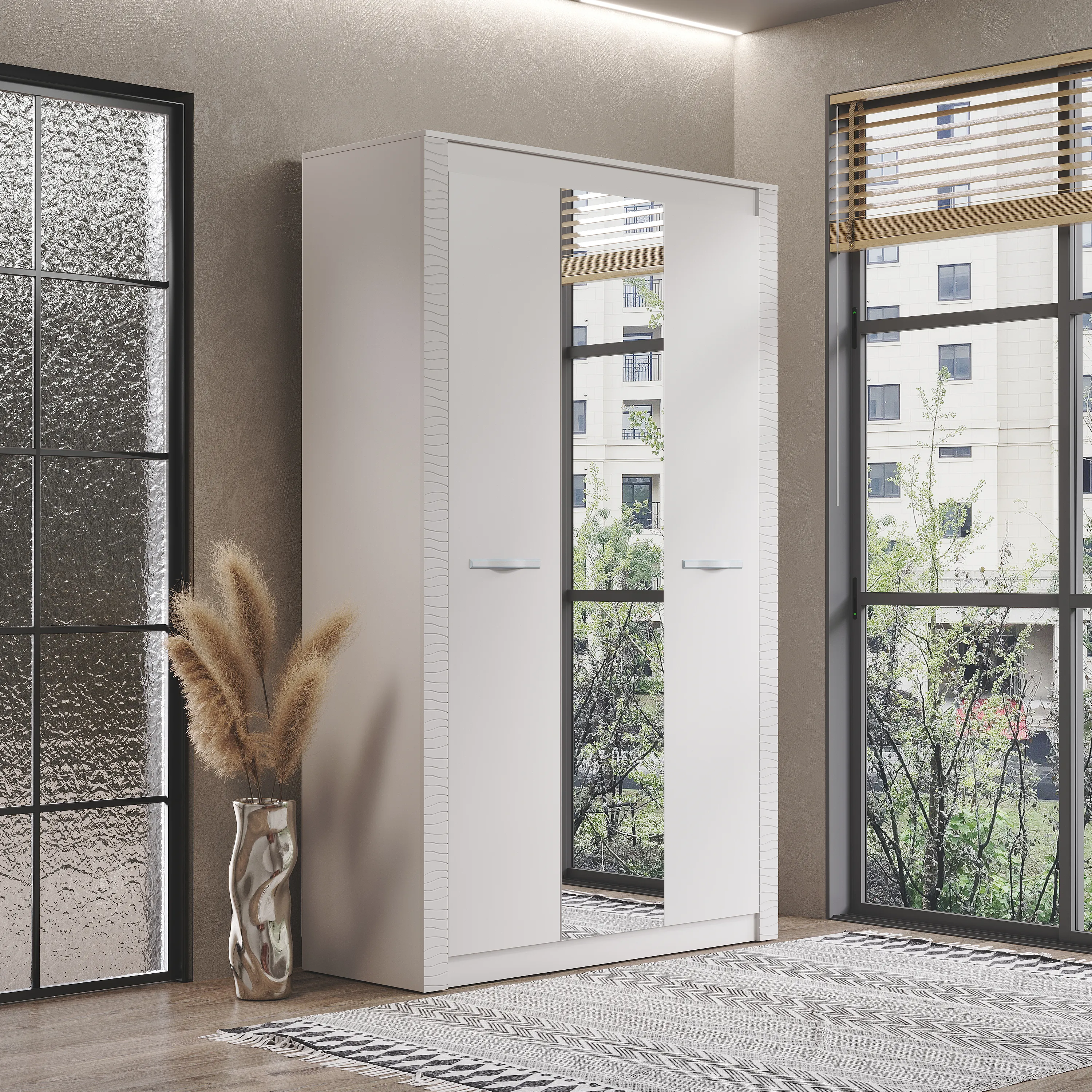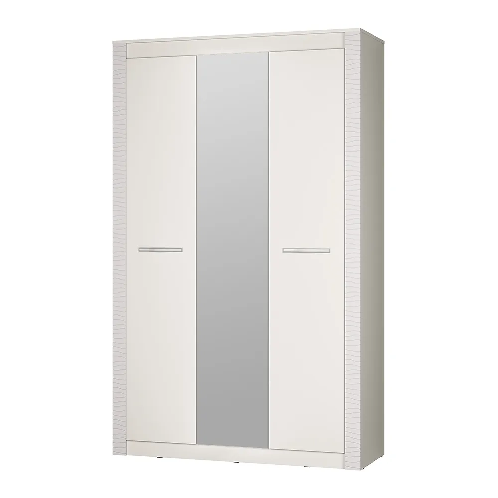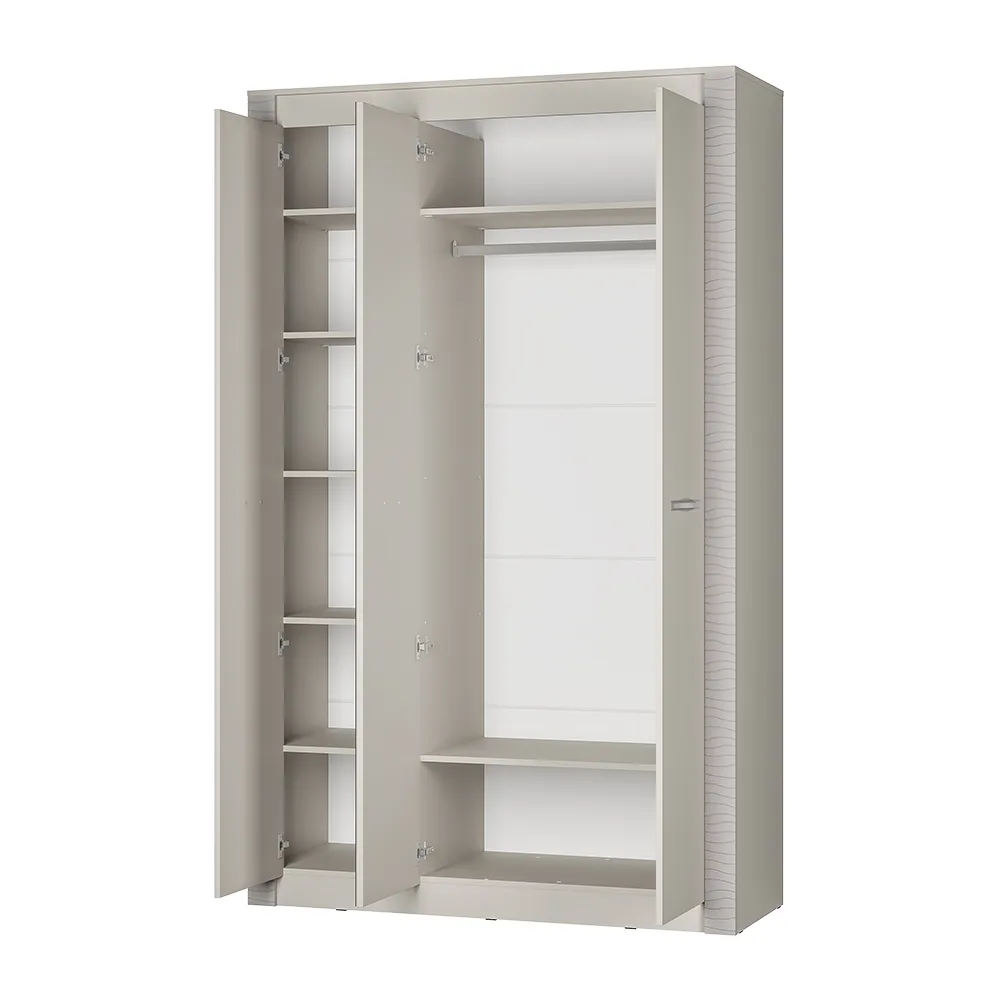 Трехстворчатый шкаф "Монако" относится к одноименной модульной серии. Модель не имеет вычурного декора и лишних деталей, выполнена в сдержанном и лаконичном стиле. Комплектация шкафа представляет собой несколько полок для хранения вещей в сложенном виде, а также отделение с хромированной штангой для одежды на вешалках. Для создания модели используется качественная ЛДСП цвета "кашемир". Центральная створка является полностью зеркальной, две остальные дополнены изящными ручками.