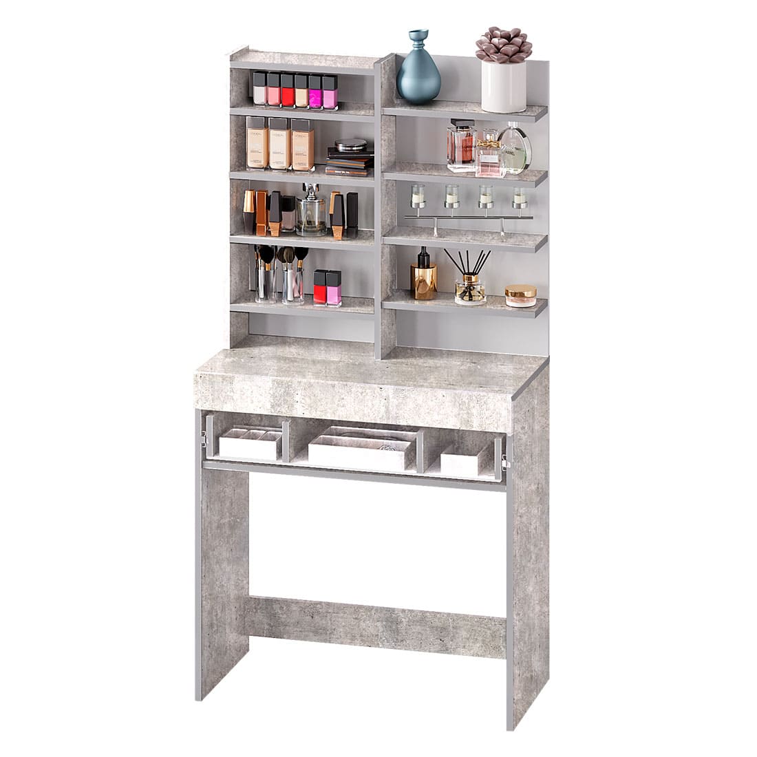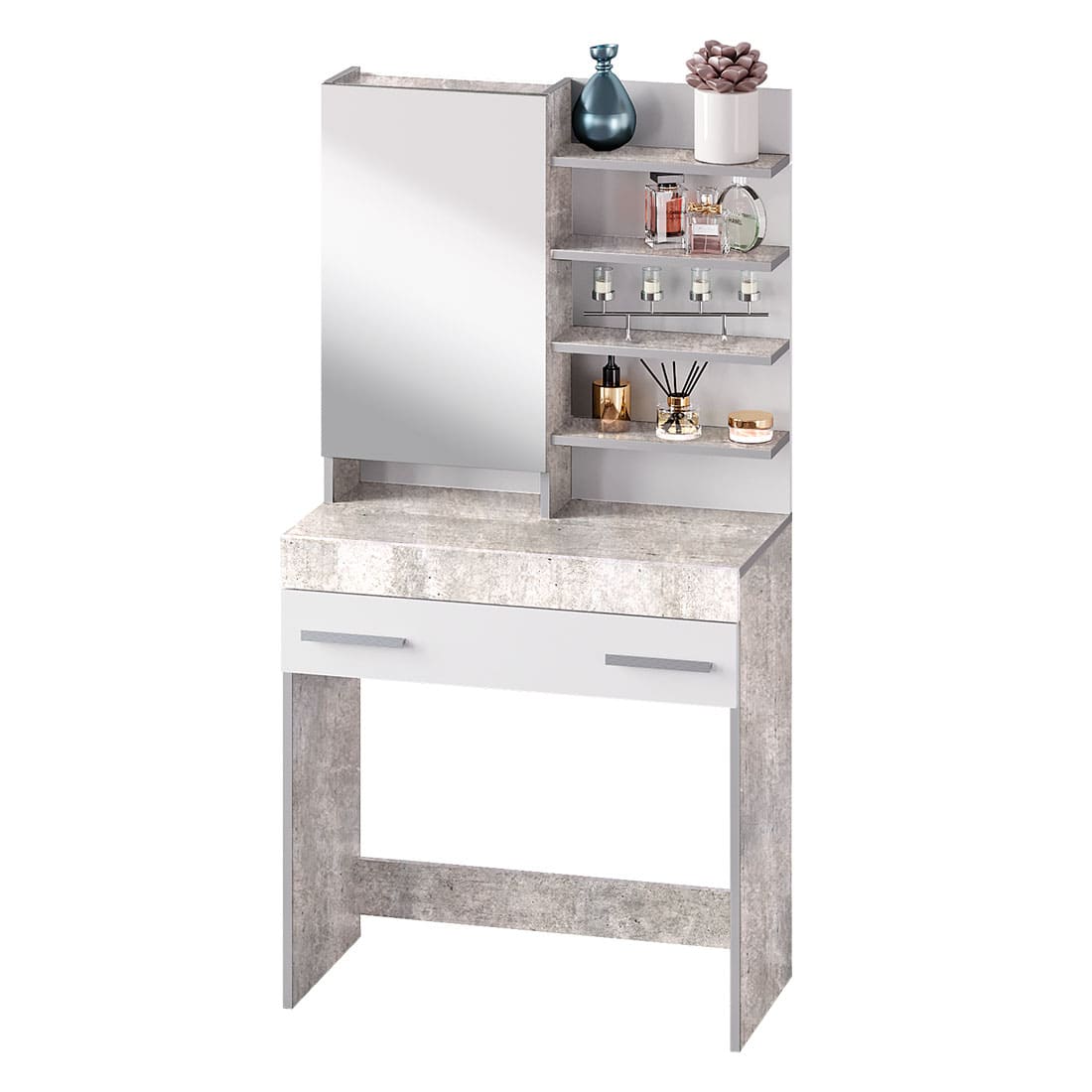 Косметический стол из мебельной коллекции "Инстайл" – незаменимый атрибут для любой женщины! Разместить все необходимые бьюти-гаджеты, средства для ухода за лицом и волосами можно в данной модели. В столешницу встроен выдвижной ящик с отделениями для хранения различных мелочей или украшений. Туалетный столик обладает большим количеством полок, часть из которых спрятаны за зеркальной дверцей, а часть является открытыми, чтобы предметы первой необходимости всегда были под рукой! Гармоничное сочетание белого и серого цвета позволит косметическому столу украсить любой интерьер.