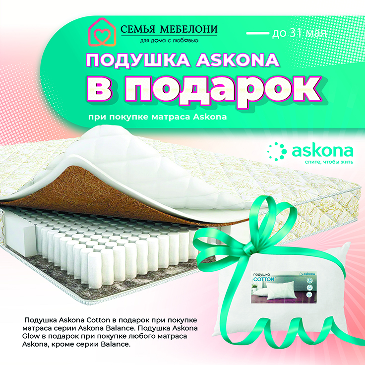 До 31 мая ДАРИМ подушку Askona Cotton при покупке матраса серии Askona Balance!