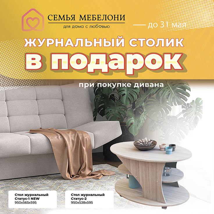 До 31 мая ДАРИМ журнальный стол "Статус-1 NEW" либо "Статус-2" (на выбор) при покупке любого дивана!