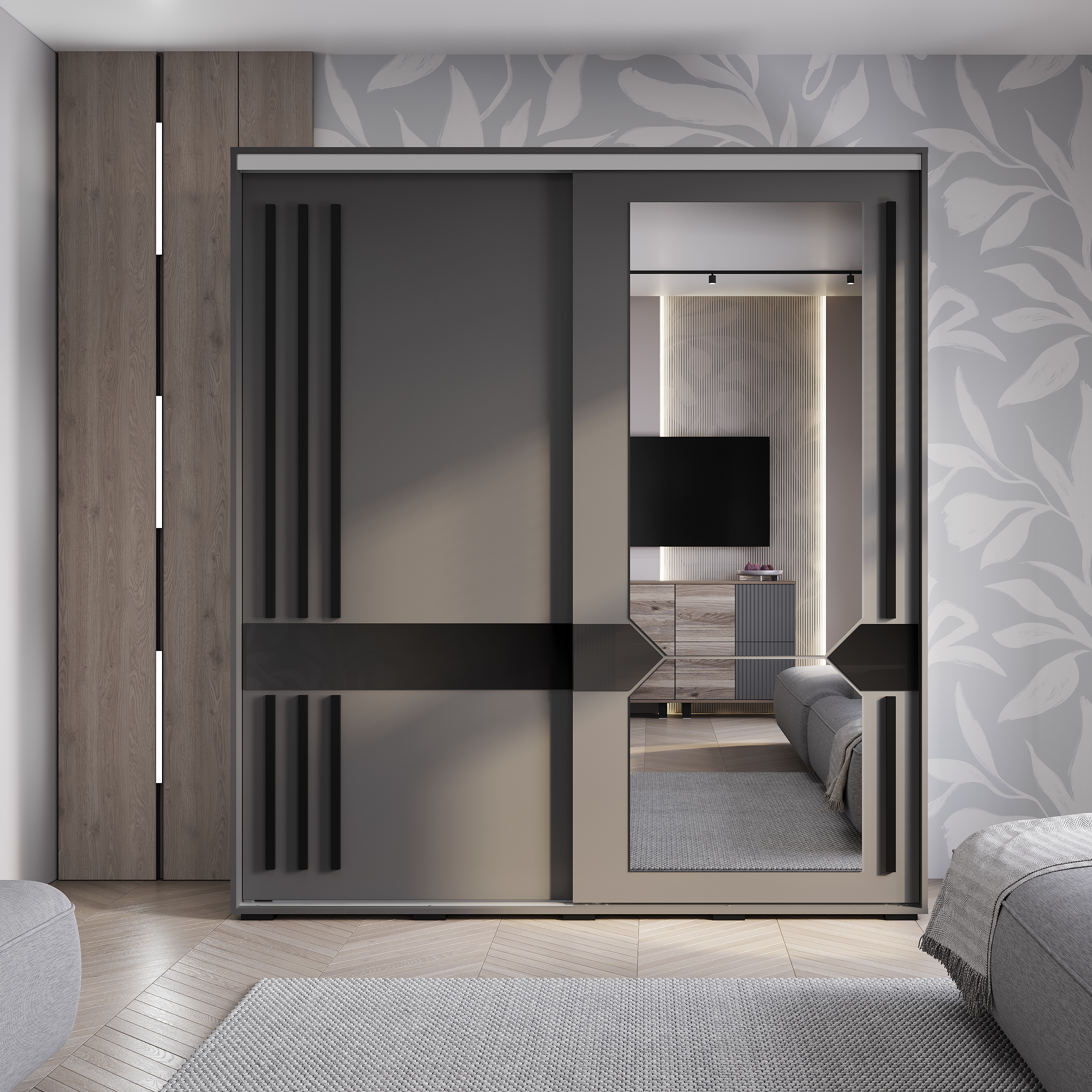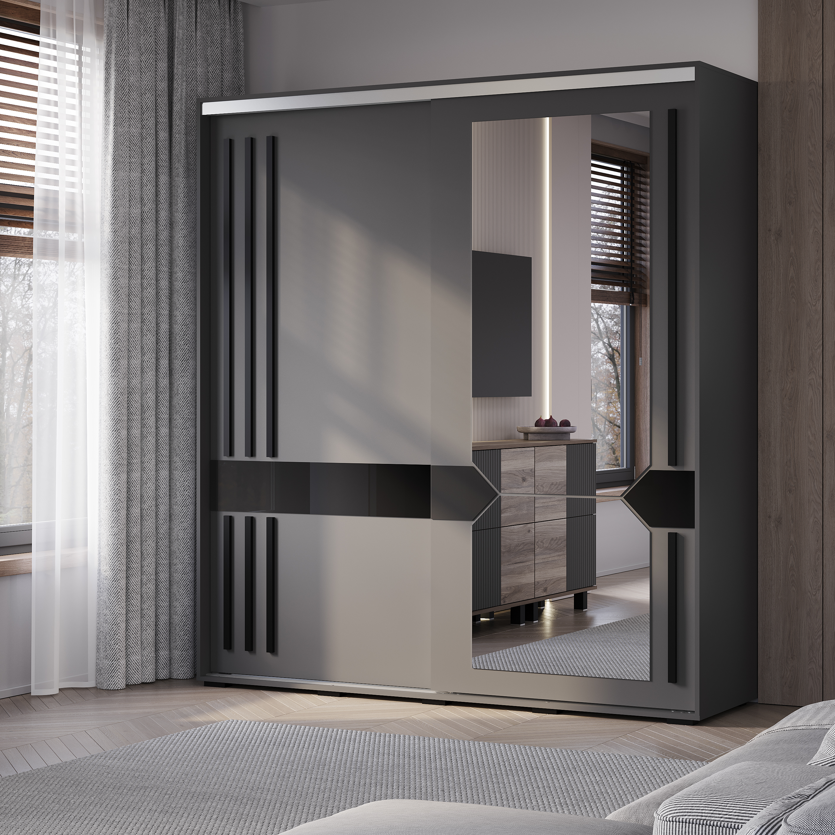 Практичный и многофункциональный шкаф-купе "Крафт-9" подойдет для любой комнаты вашей квартиры или дома. Двери шкафа оснащены стильными длинными вставками из черного МДФ -профиля, выполняющими роль ручек. Шкаф украшен роскошным зеркалом с интересной геометрической формой, которое не только выполняет свою практическую функцию, но и становится изысканным акцентом. Лакобель в черном цвете добавляет интерьеру глубину и шарм, придавая ему стильный и солидный вид.